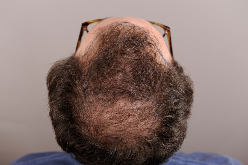 Haha ja ich gebe dir eigentlich recht... verrückterweise, denn wie man auf den vorher-Bildern sehen kann, ist der Haarstatus oben äußerst bescheiden... vielleicht kommt das von noch viel vorhandenen Mikrohaaren, die allesamt kurz vorm absterben sind und eben auf der Glatze sichtbar sind, nicht aber als "richtige dicke Haare" bei längeren Frisuren.