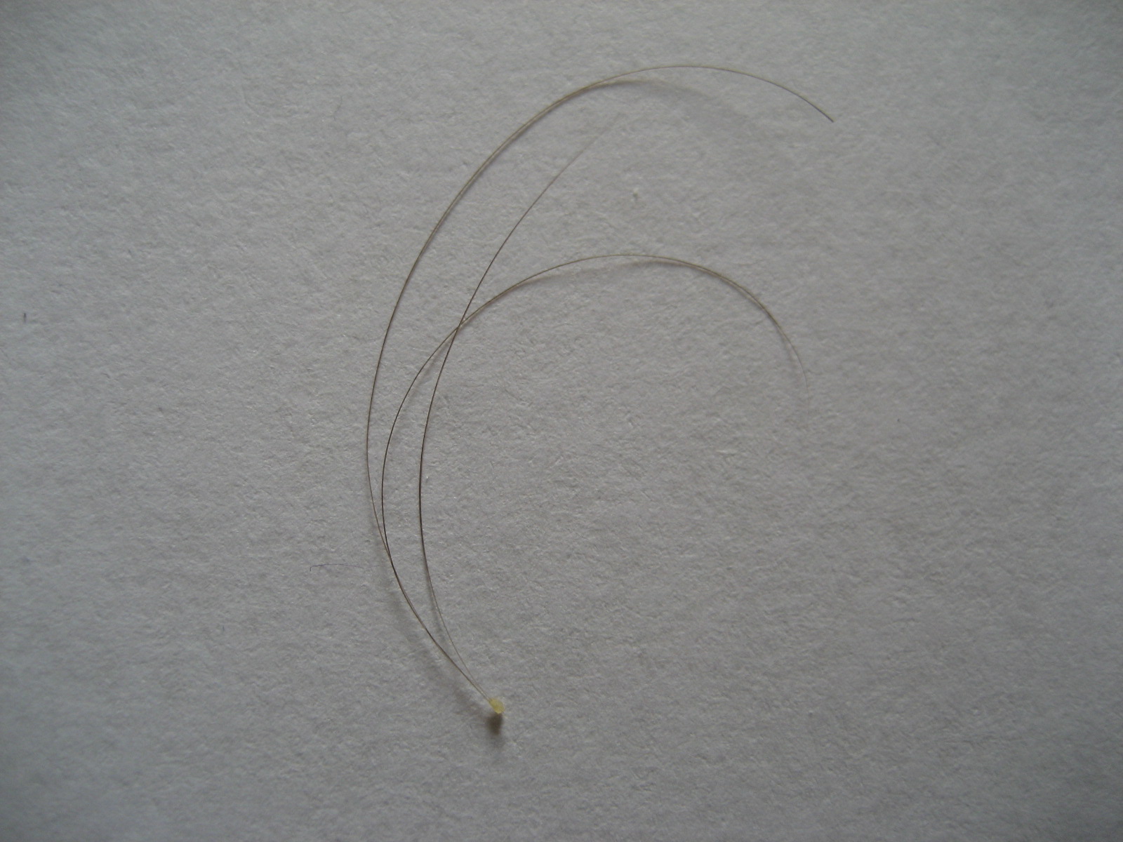 Hier zeige ich jetzt euch noch so ein typisches Foto!! So sehen ca. 70% der Haare aus die mir ausfallen!! 3 Haare die unten an so einem eiter Klumpen oder Schuppe oder was weiß ich zusammen hängen!! ich hoffe ihr könnt es sehen!!