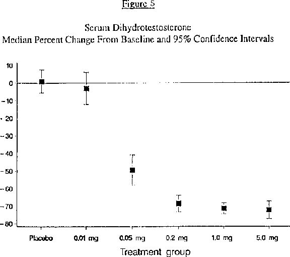 Den Unterschied zwischen 5 mg Finasterid (Proscar) und 1 mg Finasterid (Propecia) in der Wirkung auf die 5-alpha-Reduktase kannst du in der daraus resultierenden DHT Absenkung erkennen: