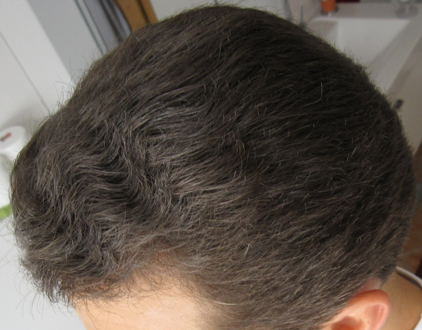 Ihr seht vielleicht, die Haare haben gerade einen gräulichen schimmer. Dieser stammt vom Minox. So sehen sie aus, wenn ich das Mittel 3x aufgetragen und verteilt habe ohne sie zwischendurch zu waschen. Nach dem Waschen ist der Schleier aber völlig verschwunden.