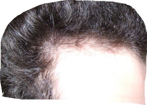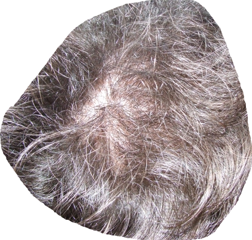 Wie ihr auf den Fotos oben im ersten Beitrag sehen könnt, sind meine Haare von einer sehr dicken Struktur, daher kann ich alles gut kaschieren bzw. es kaschiert sich selber. Trotzdem ist, mit hellem Blitzlicht, deutlich die Glatzenbildung auf dem Hinterkopf sowie die schon ziemlich hohen Geheimratsecken zu erkennen.