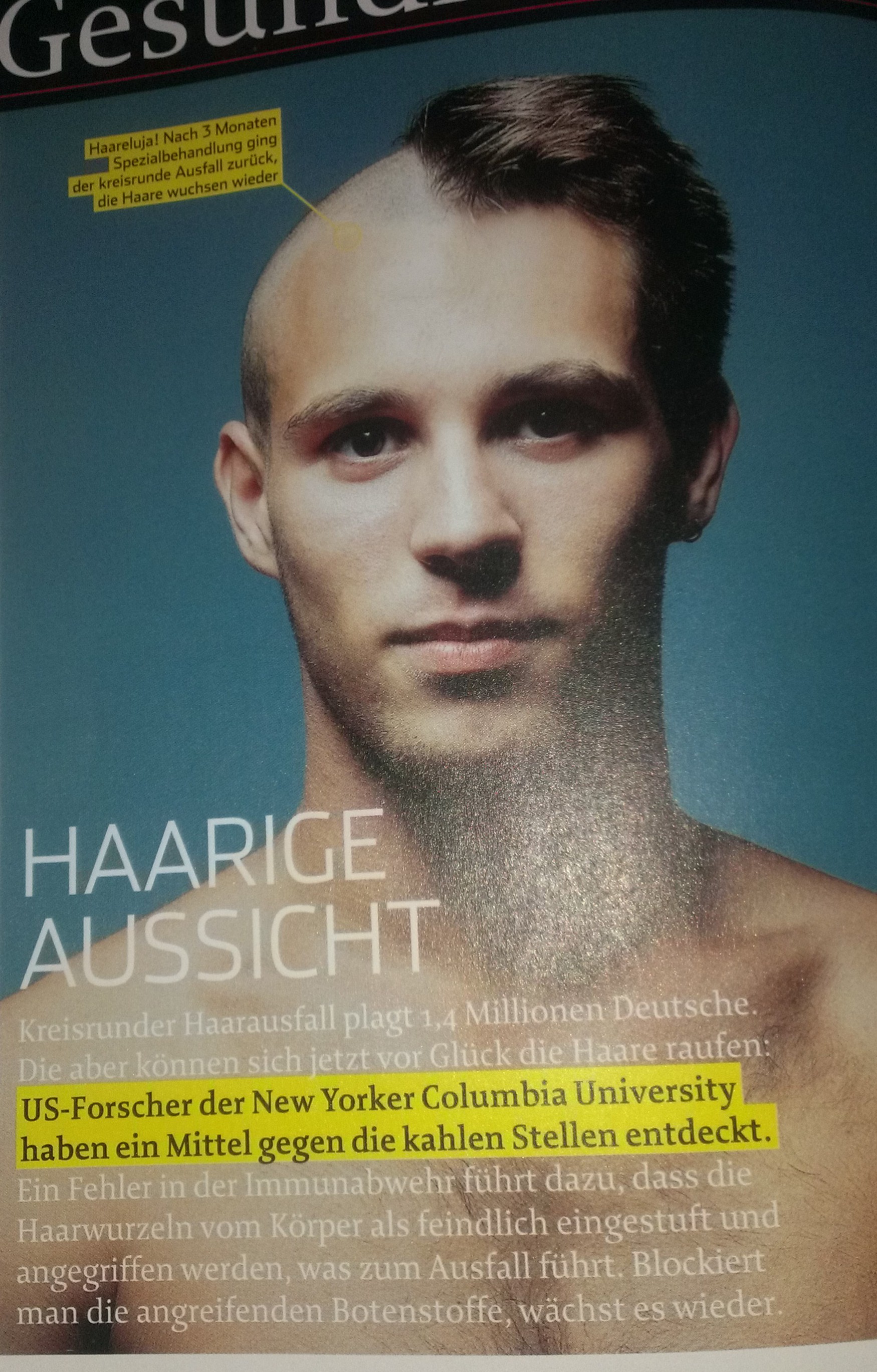 ich habe mir heut wieder die Mens Health Zeitschrift geholt und fand einen kurzen Artikel über Kreisrunden Haaausfall..