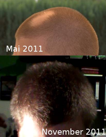 Im Verlauf des Sommers konnte man auf den kahlen Stellen immer mehr sehr feine weiße flaumartige Haare ausmachen. Das nahm ich als gutes Zeichen und dem war dann auch so... Mitte Herbst waren meine Kahlen Stellen wieder zu gewachsen. Zudem sind die Haare an den vorher kahlen Stellen nun wesentlich dichter. Auf drängen meiner besseren Hälfte samt meiner und ihrer Familie lasse ich die Haare gerade wieder wachsen, obwohl ich meinen 3mm-Schnitt eigentlich ganz gerne mochte. Falls es wieder losgehen sollte werde ich nicht warten und direkt den rasierer auspacken.