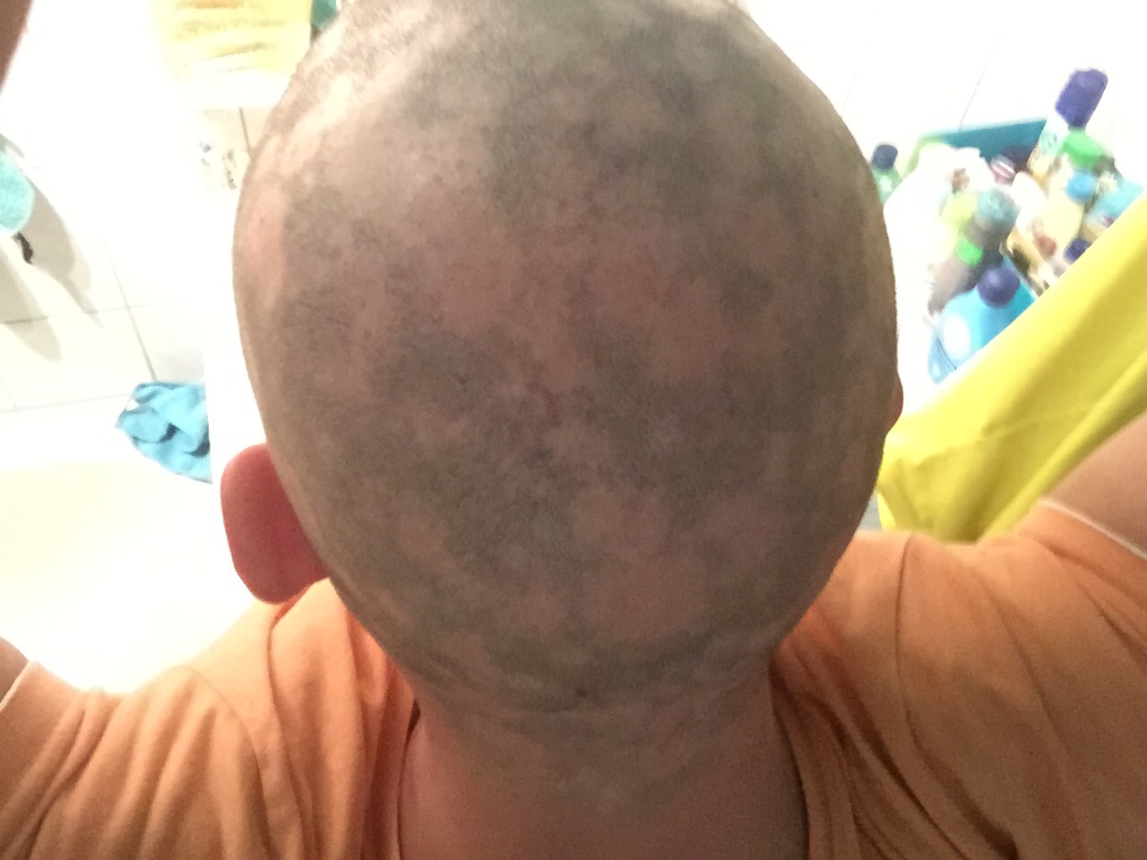 Dort sind auch schon dünne weiße Haare , aber diesen Stillstand habe ich jetzt schon zwei drei Monate . Trotz allem bin ich sehr froh und laufe auch wieder ohne Mütze rumm. Auch meine Augenbrauen sind solangsam wieder da. Nur halt mein Bart und diese beiden Stellen im Nacken noch .