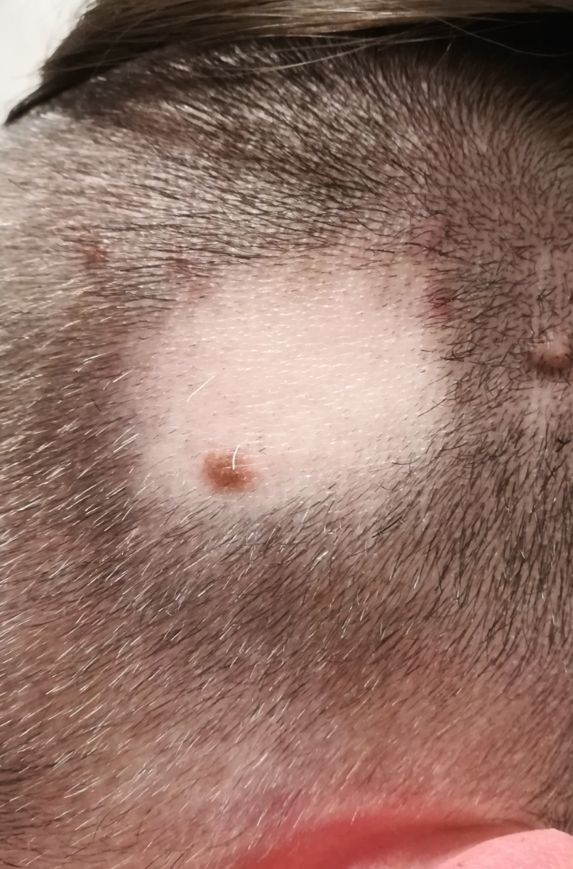 Ende Februar dann der Schock... Eine ca 1cm große Stelle an der rechten Kopfseite.
