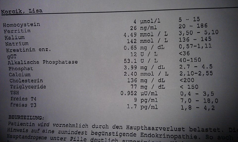 wurden nachher nochmal beim Hausarzt kontrolliert und waren identisch. Versuche das mal eben zu fotografieren. Mich würde interessieren ob durch diese Werte eine androgenetische Alopezie ausgeschlossen werden kann. Mich beunruhigt der Oberkopf und Scheitelbereich extrem.