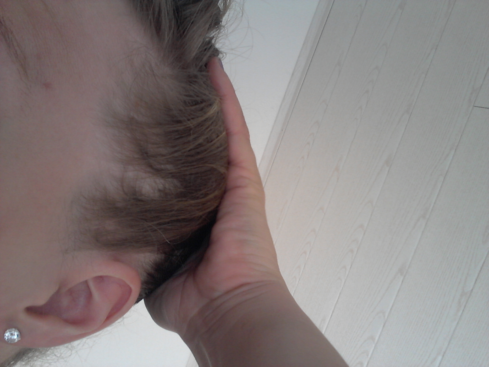 Ich habe lange Haare und Strähne mit die Haare um etwas mehr Fülle zu simulieren, dadurch kann ich gut meine Geheimratsecken verstecken aber es belastet einen doch sehr als noch junge Frau.