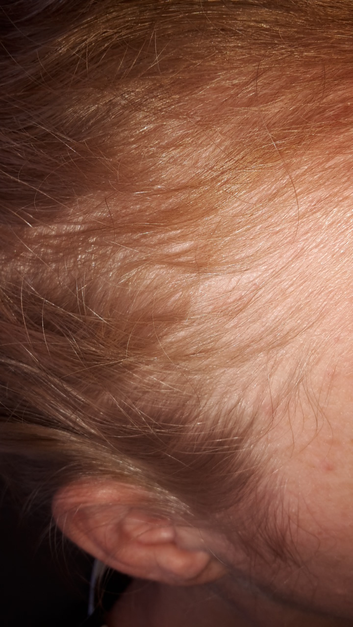 Mein Haarausfall/dünner werdendes Haar ist diffus über den ganzen Kopf verteilt. Vor 16 Monaten habe ich ein Baby bekommen. In der Schwangerschaft hatte ich null Haarausfall. Ca. 5 Monate danach den normalen "nach der Schwangerschaft Haarausfall".
