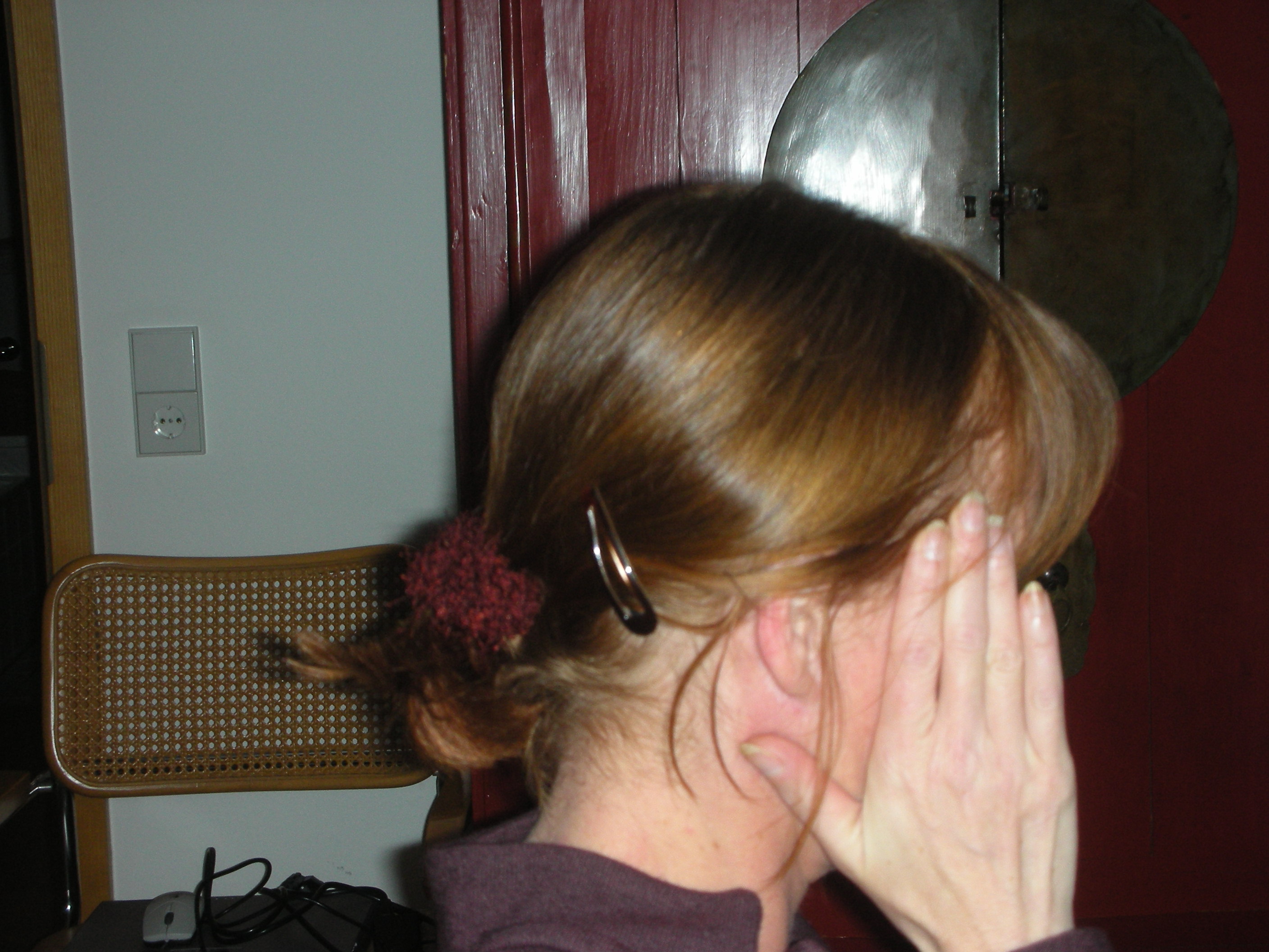 Ganz neu trage ich jetzt eine Tresse von Micro-Bellargo. Sie geht von Ohr zu Ohr über den Hinterkopf undwird mit den eigenen Haaren verknüpft. Eine kleine Hülse verhindert, daß die