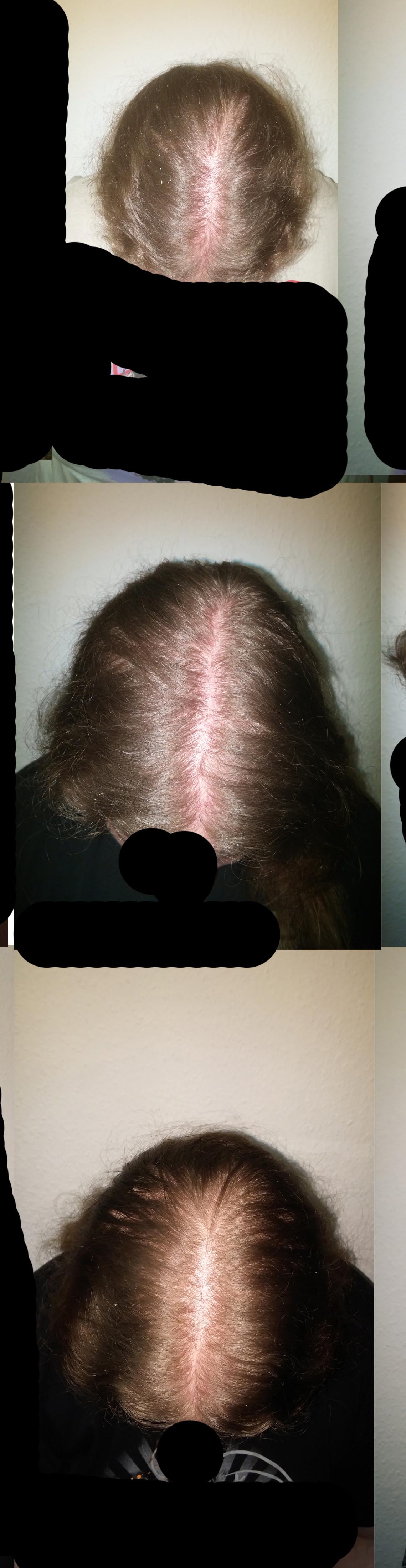 Mein Haarausfall von früher ist weg. Ich verliere maximal 40 Haare am Tag, aber ich habe immer noch das gleiche Problem wie früher: Es wächst kaum was nach, gerade die Problemstellen von früher, sind es heute immer noch.
