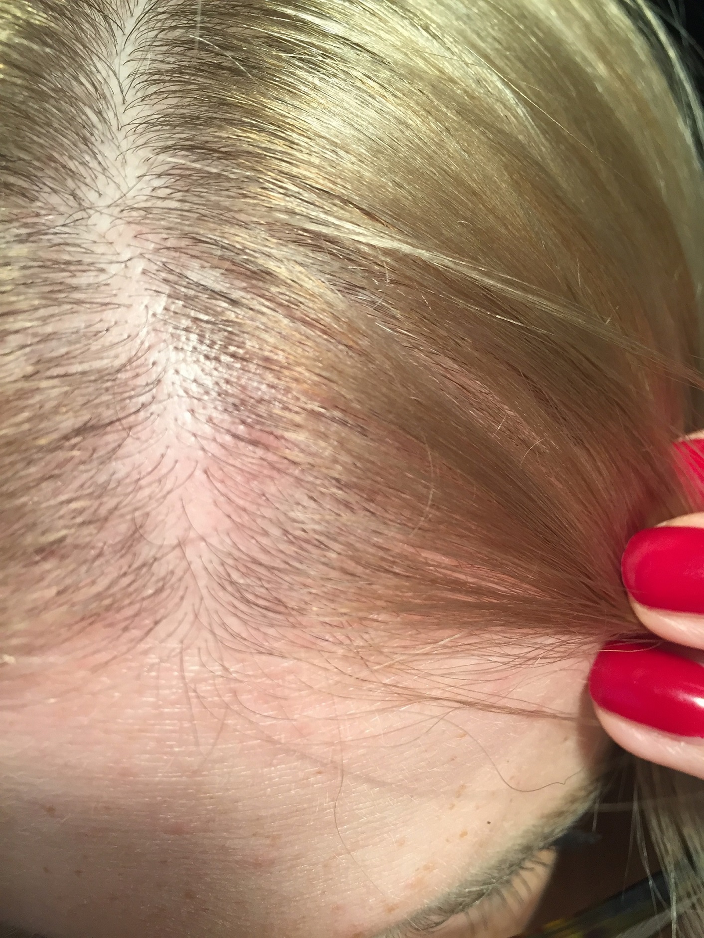 1. Diese roten Flecken auf der Kopfhaut: Hast Du die nur an den lichteren Stellen? Seit wann hast Du die bemerkt? Sind sie schuppig, das man auch von einem Ekzem sprechen kann? Oder könnte es z.B. "nur" die Sonne sein, die an den lichteren Stellen ungehindert auf die Kopfhaut trifft und diese reizt?