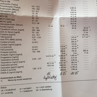 Hallo ihr, vielleicht kann mir einer seine Interpretation der Werte nennen. Laut den Ärzten ist ja wieder alles in Ordnung. Ich leide seit über 3 Jahren an Haarausfall bzw null neuwuchs. Seither stetige Verschlechterung. In 3 Jahren starke Lichtung der Haare...2/3 gefuehlt sind weg...weiterhin habe ich starke pms Beschwerden.