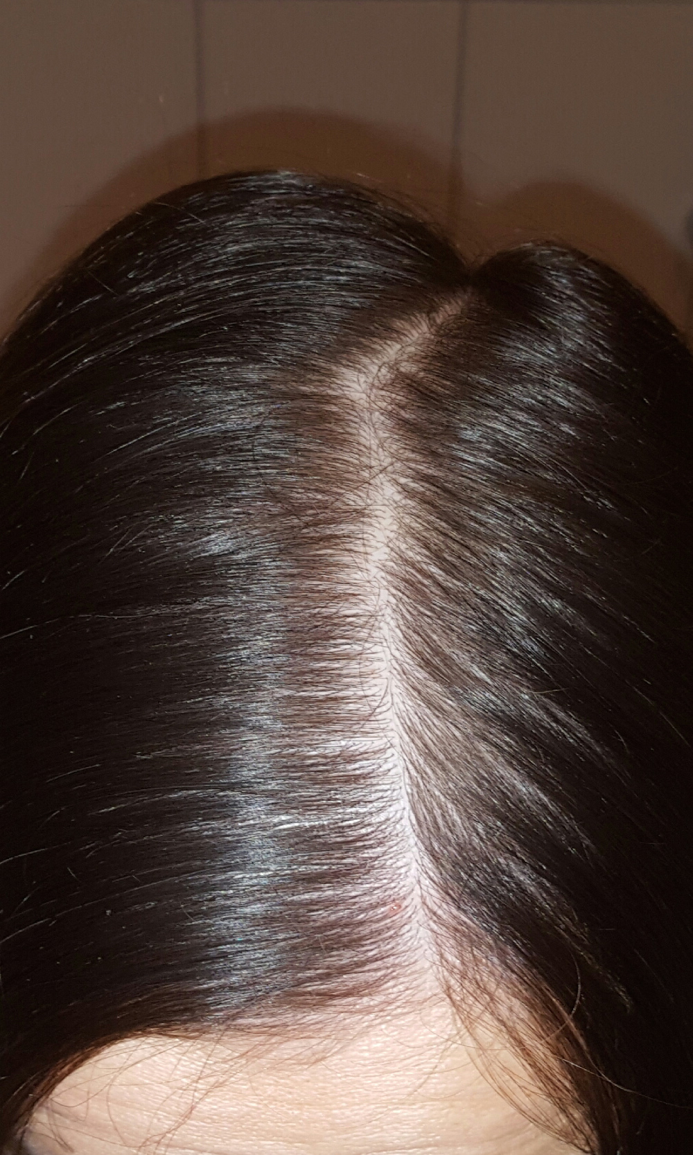 Das Bild habe ich mit Blitz gemacht.Bei mir sieht es besser aus mit dem Blitz da die Haare glänzen und vom breiten Scheitel ablenken.