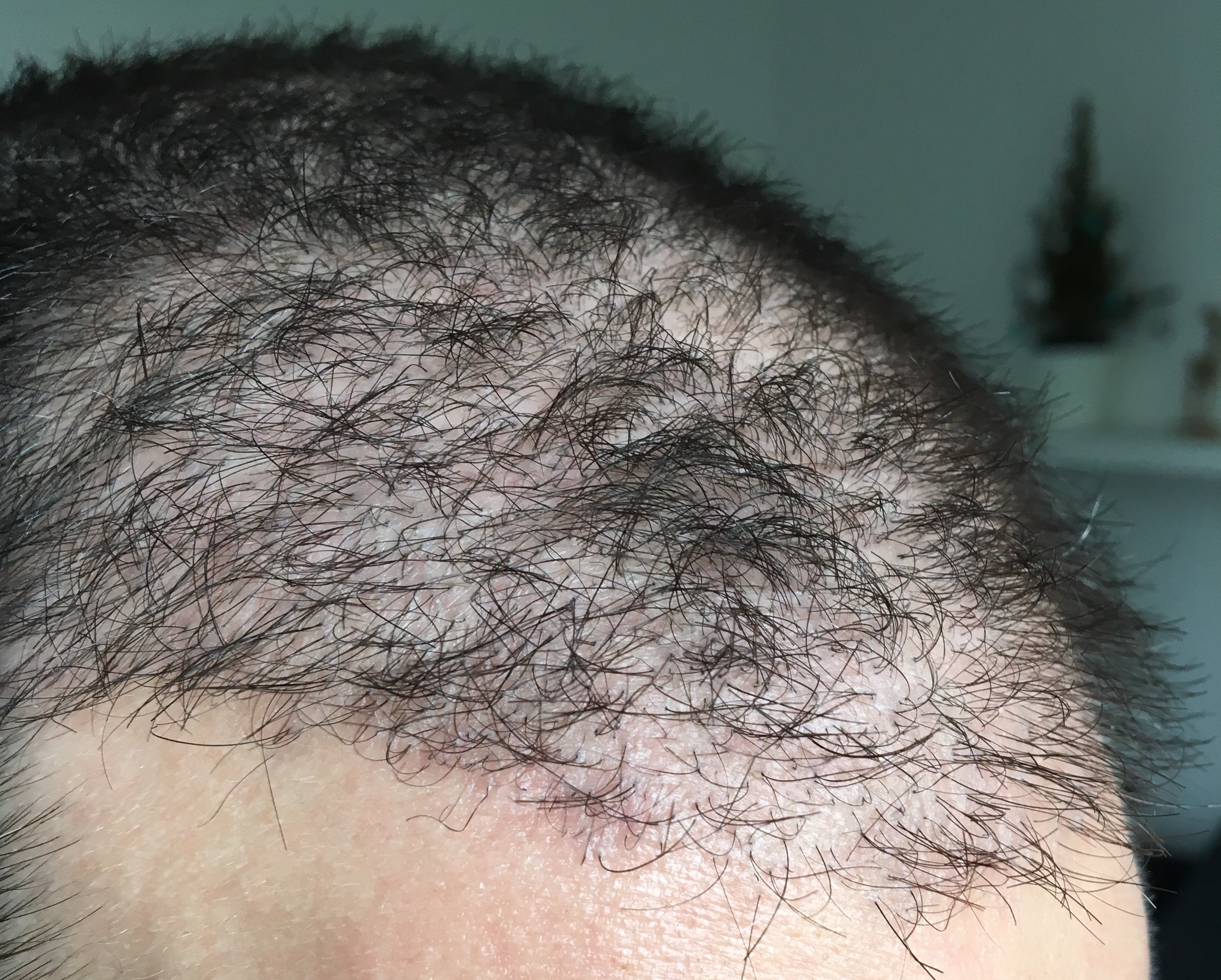 sind jetzt 5,5 monate. links und mittig hinkt noch etwas hinterher. hänge mittlerweile nicht mehr täglich vor dem spiegel, mache fotos und gucke mir jedes kleine neue häärchen an. mal sehen wie es sich weiterentwickelt- kann sowieso nichts weiter machen als abwarten...
