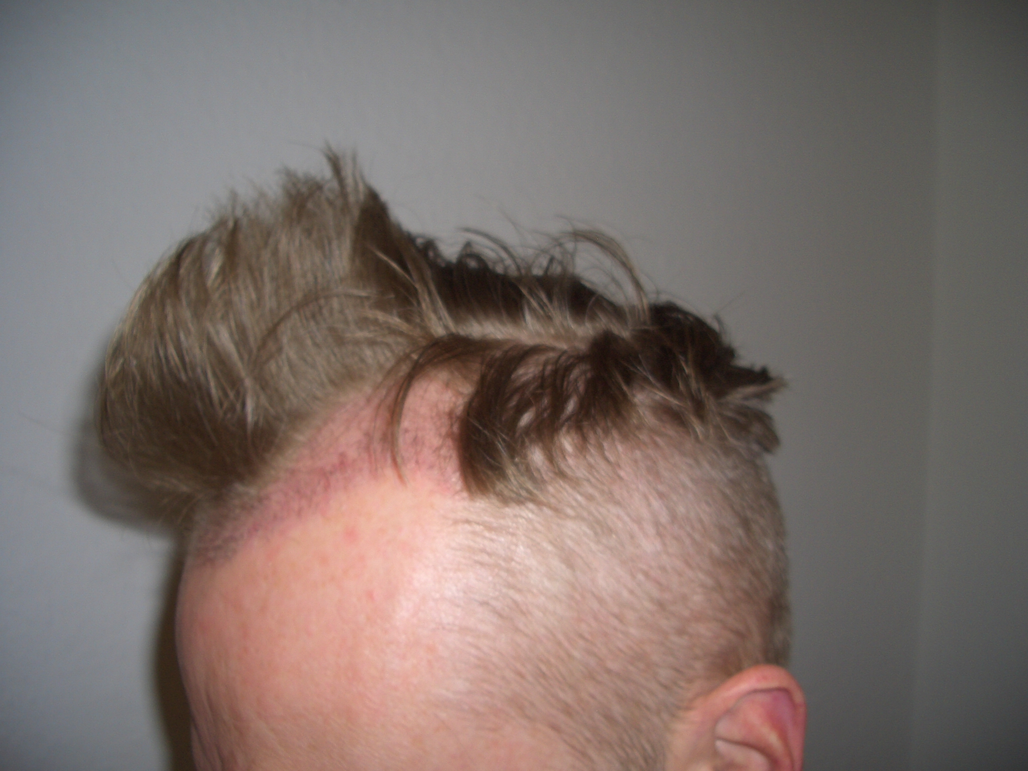 Hier im Forum wird oft die Frage gestellt: Wann bin ich wieder gesellschaftsfähig nach der HT? Das hängt natürlich sehr von der Größe der behandelten Fläche ab. Ich zeige hier mal zwei Bilder von mir: eines nach einer Woche POST OP mit Kruste, das andere 2 Wochen Post OP, wo Empfängerbereich nach dem Abfallen der Kruste relativ stark gerötet ist. Dadurch, dass die Haare auf meinem Oberkopf nicht rasiert wurden, konnte ich die behandelten Stellen nach etwa zehn Tagen, als die Krusten weg waren, ganz gut kaschieren.