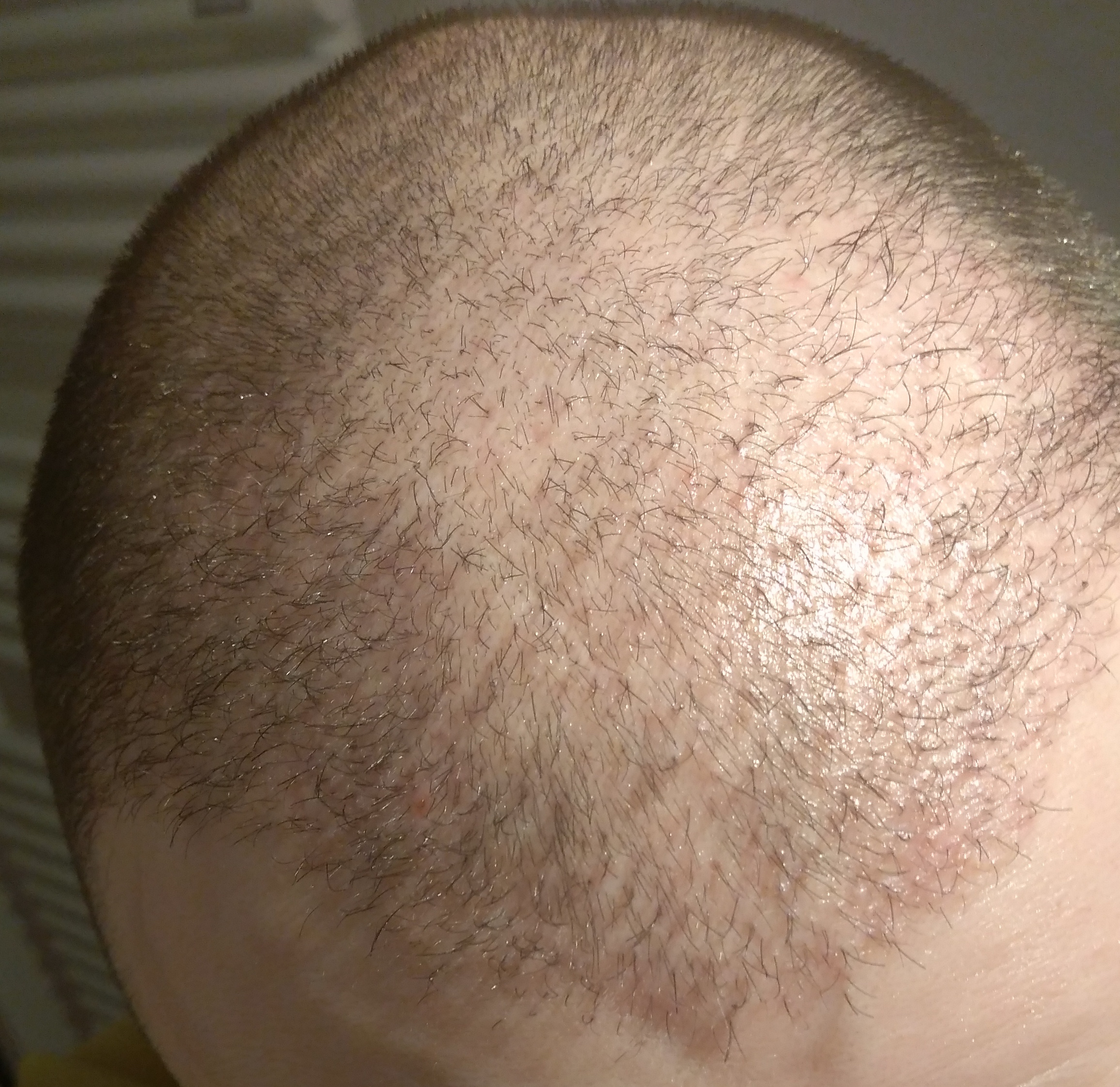 Hmm nach 5 Monaten kann man noch von keinem Ergebnis sprechen aber da sollte eigentlich vieeeel mehr da sein wenn man bedenkt, dass auf die nicht so große Fläche 3750 Grafts implantiert worden sind Surprised