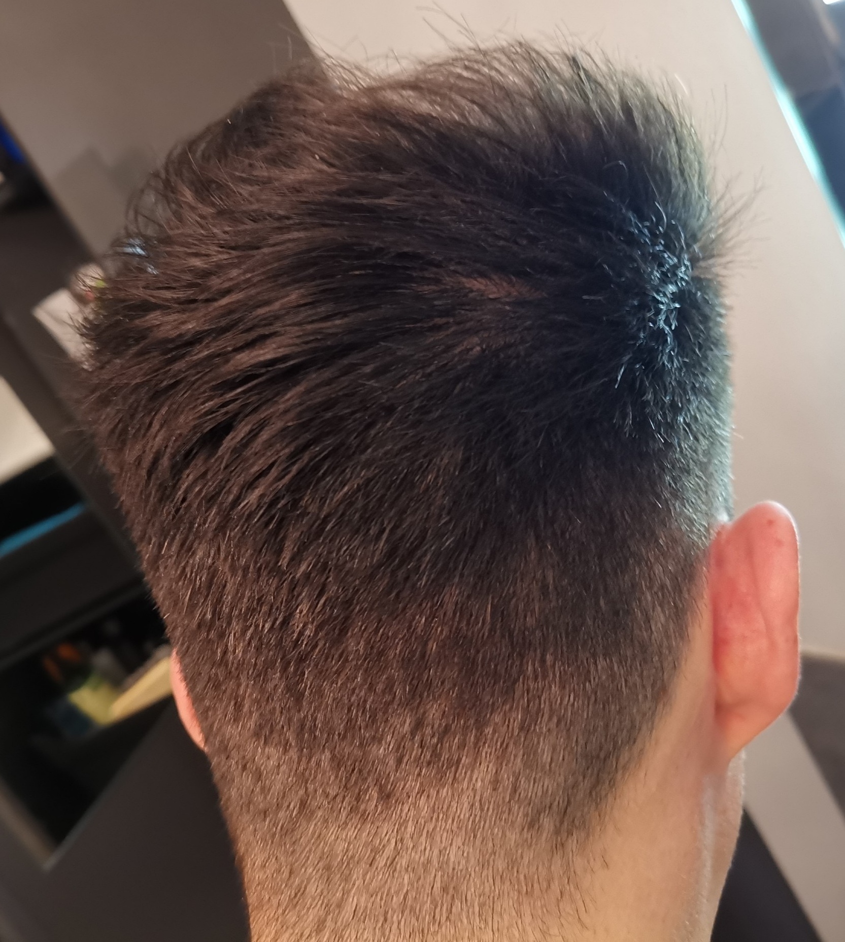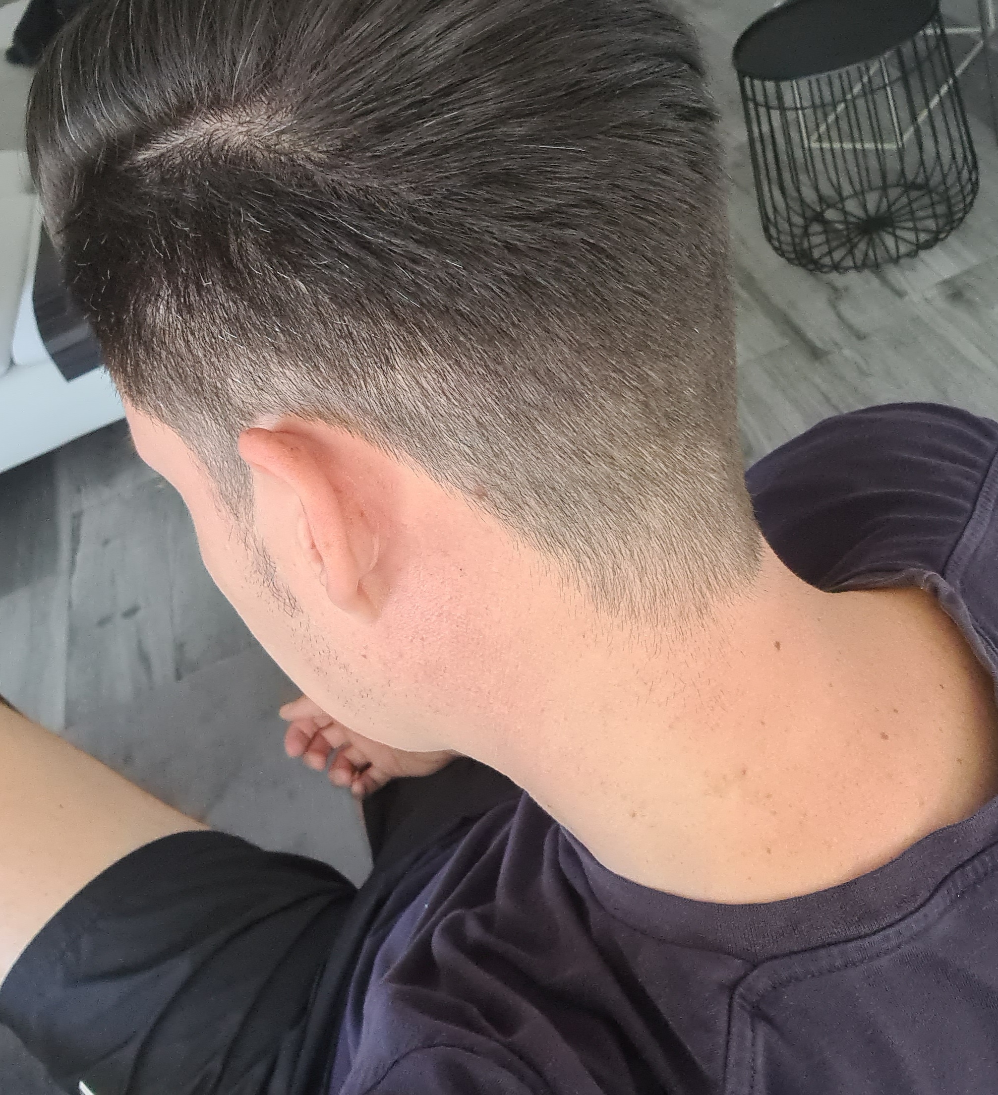 So nachfolgend bissl schärfere Bilder unter hellem Licht, Haare sind nur trocken geföhnt. Spender ist frisch geschnitten auf 4mm.
