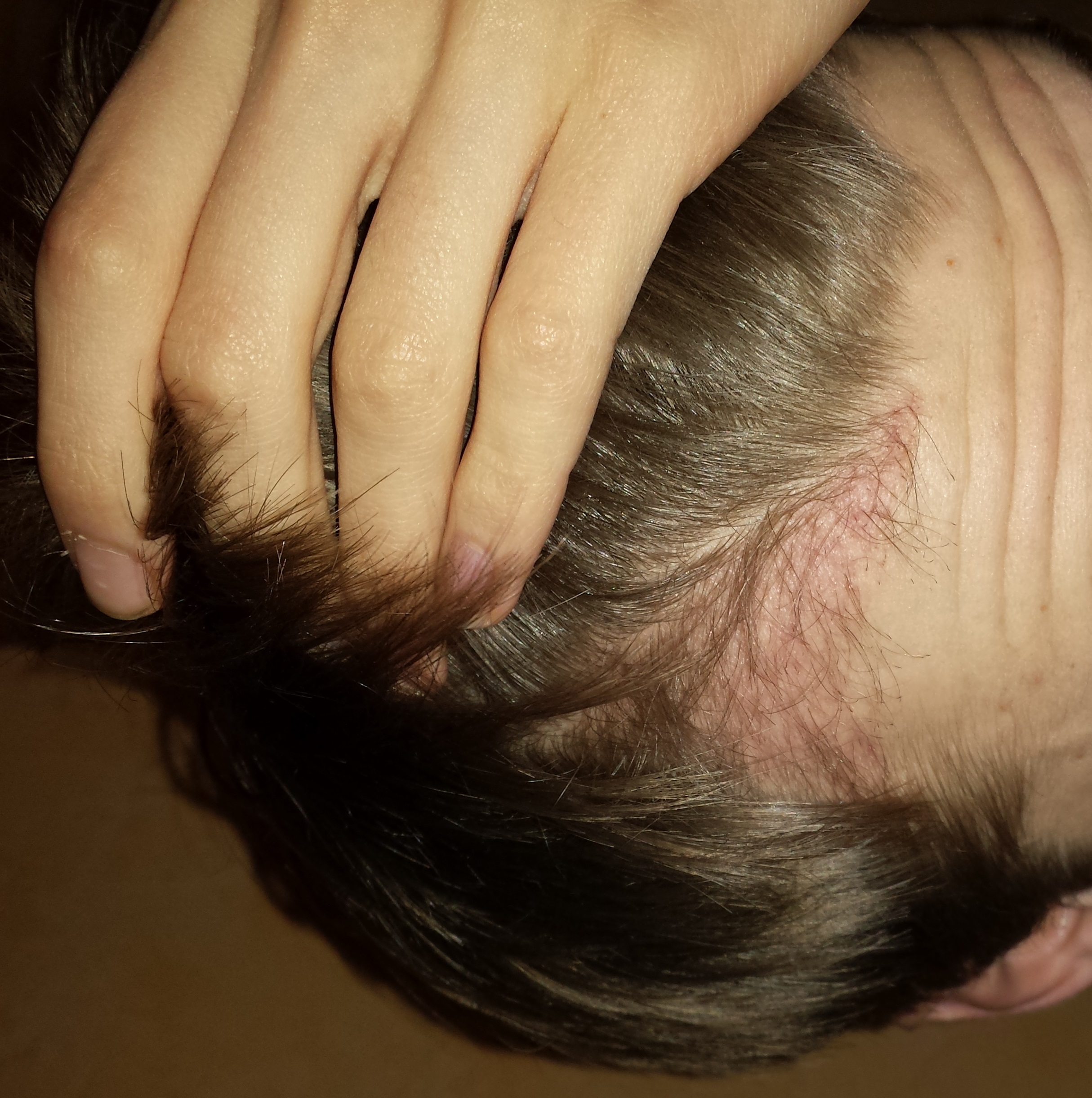 Man kann auch schon einige dünne Härchen erkennen die im transplantierten Bereich wachsen. Das sind denke ich die Haare, die nicht wieder ausgefallen, sondern direkt angewachsen sind. Die dichter wirkenden Haare an den Seiten des Gebietes (besonders bei der linken GHE) sind die nur OP wegrasierten Haare, in die auch hineintransplantiert worden ist, da sich das Haar an der Stelle auch schon ausgedünnt hat. Diese wachsen jetzt gerade normal nach.