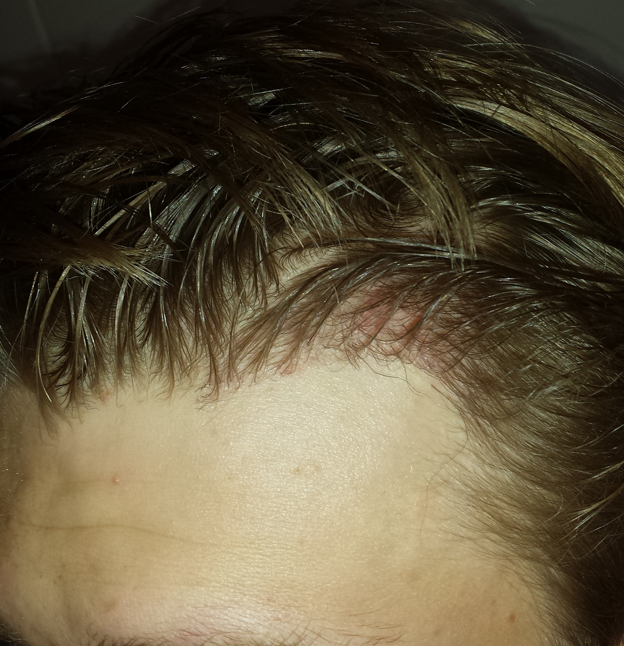 Noch kurz zu den Bildern: Die kürzeren Haare in den transplantierten GHE sind die zur OP wegrasierten Haare, die gerade nachwachsen. Den spitzen Haaransatz hatte ich schon immer.