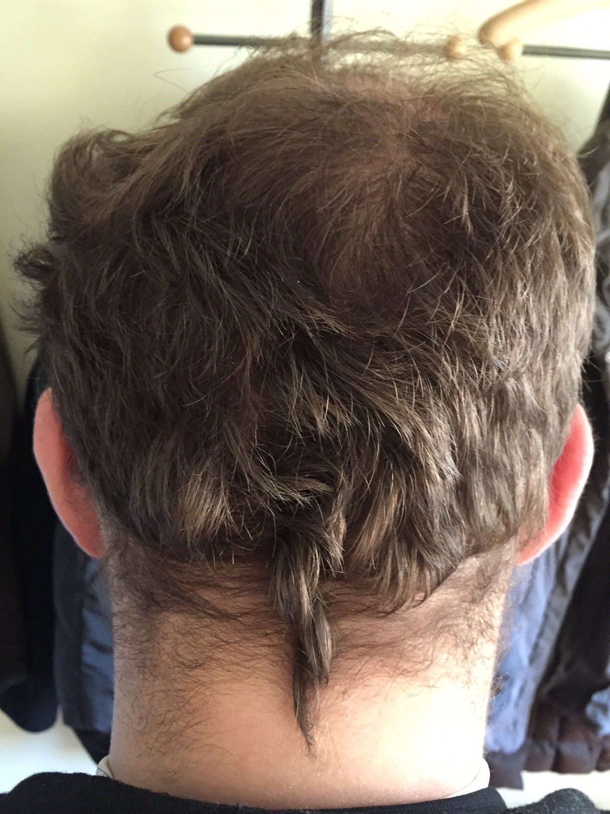 Dass die Haare oben an der Tonsur dünner aussehen ist ja klar, da keine Überlagerung.