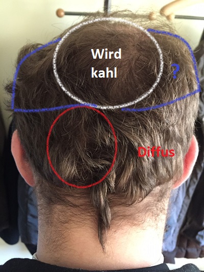 Grundsätzlich bin ich mir natürlich im klaren, dass in meinem Fall letzlich nur eine Haarkrone übrig bleiben wird. Ich hoffe jedoch, dass die Ärzte dies durch ein geschicktes Abdecken (wenn auch mit weniger Volumen im oberen Kopfbereich) kaschieren können.