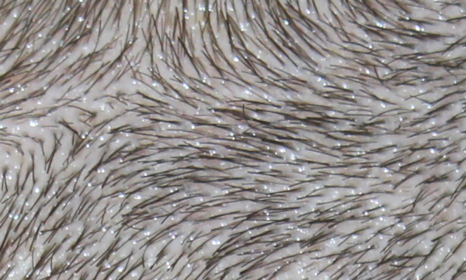 Interessant finde ich übrigens, dass Keser ja an den Schläfen nur sehr sehr sehr dünn und weit von einander entfernt die Haare gesetzt hat. Diese Folikel sind weiterhin alle fleißig am wachsen, während bei dem restlichen Haar gerademal ca. 10-20% zu sehen sind. Mir scheint als wenn die Dichte in Zusammenhang steht mit dem Einsetzen der Wachstumsphasen nach der OP. Oder es hat mit dem Areal zu tun.......