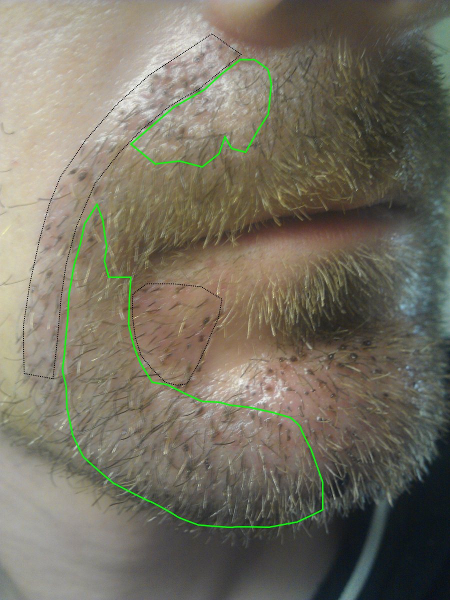 Die Anzahl Haare wurde nicht genutzt, um die bisherigen Bartstellen zu verdichten vielmehr bekam ich einen weiteren Rand um den Bartbereich gezeichnet, der gerade im Schnauzbereich dafür sorgt, dass nun über einem klaffenden Spalt die neuen Haare angesetzt wurden und darunter mein eigentlicher Bart beginnt.