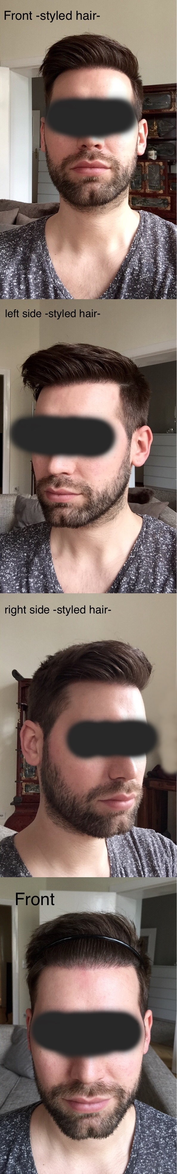Anbei die gewünschten Bilder vom "Zustand" meiner Haare vor der HT. Mir ging es wie gesagt vor allem um die Schließung meiner Geheimratsecken (welche ich immer überkämmt habe) und eine Herabsetzung der Haarlinie (diese war immer schon recht weit hinten).