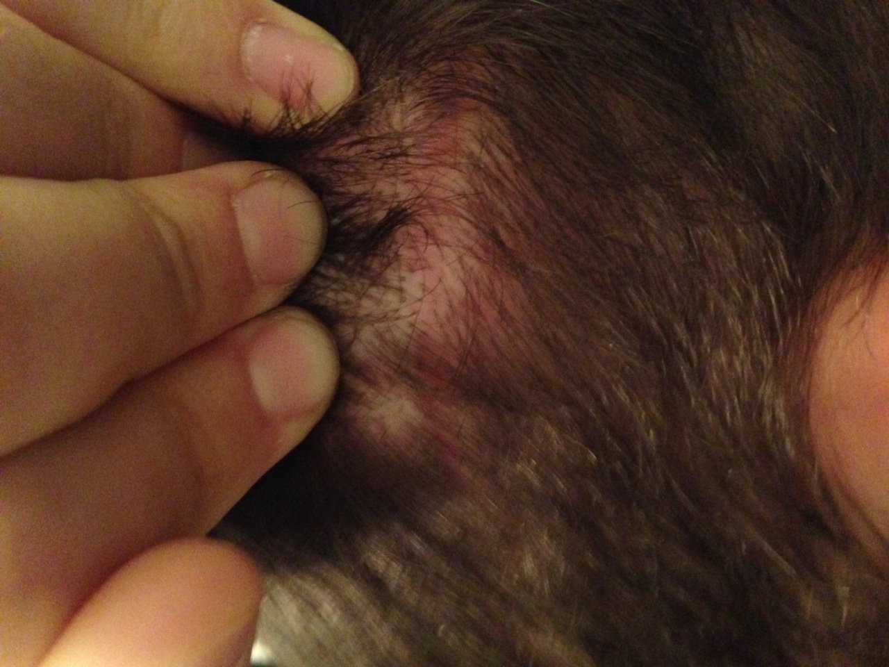 Die Haare sind ca. 11mm lang. Auf der linken Seite ist sie nur zu erahnen, auf der rechten Seite sieht man die narbe noch etwas stärker, da dort mehr "shockloss" stattfand .. Die Nahaufnahme der rechten Seite ist die "schlechteste" Stelle der gesamten Narbe.