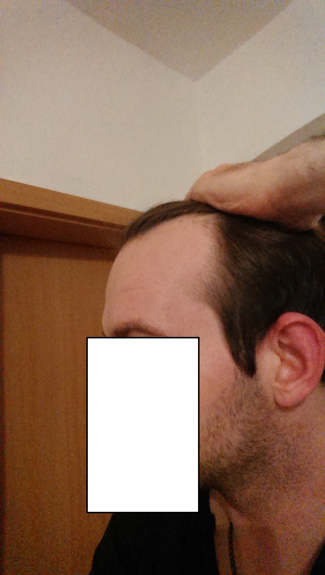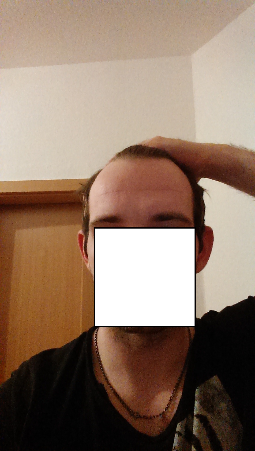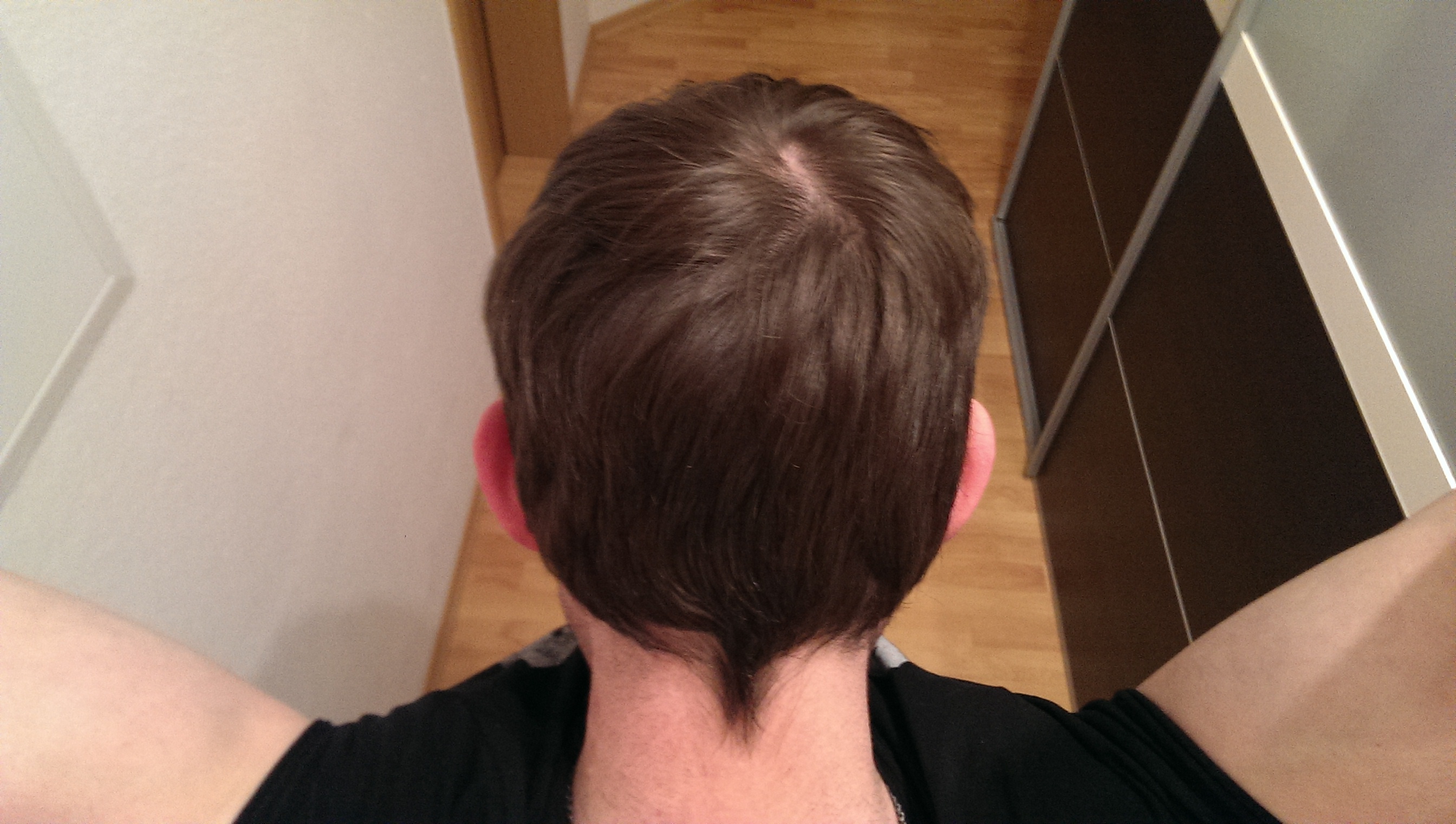 Ich habe mich entschlossen hier nochmal meine Bilder zu posten. Ich denke, man sollte relativ eindeutig sehen, dass mich meine Geheimratsecken durchaus stören dürften. Bitte nicht durch den Haarwirbel am Hinterkopf erschrecken lassen, der sieht in diesem frontal-von-oben-Licht gerade "undichter" aus, als er wirklich ist ...