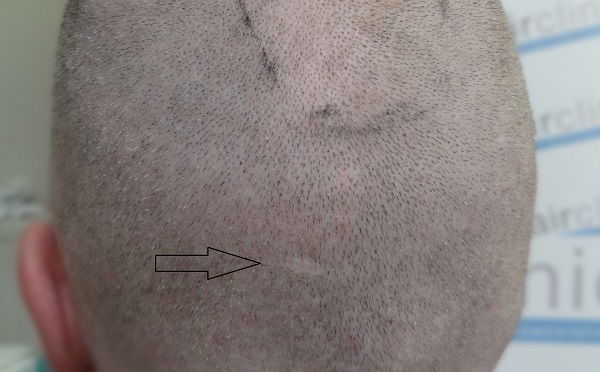 Auf den bild ist auch einem 'normale' narbe zu sehen, von einem unfall vor meheren jahren. Obwohl dieser narbe nicht sehr gross ist fallt sie deutlich mehr auf wie die entnahme stellen von der FUE.