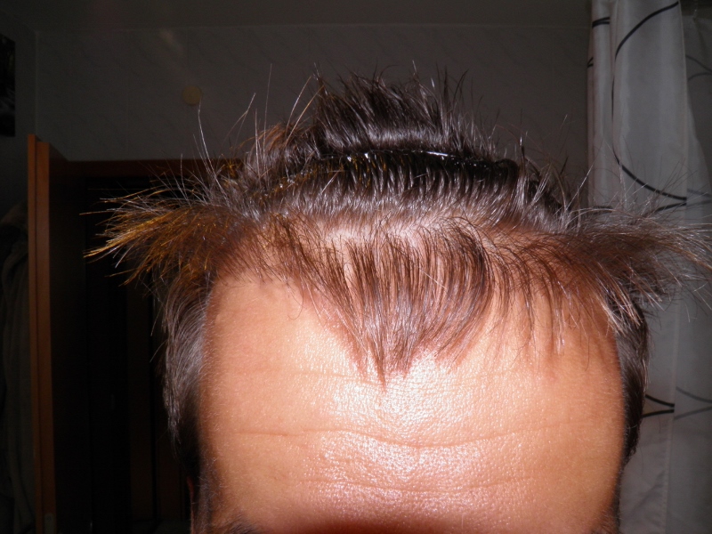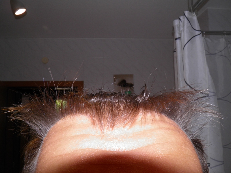 Zu den Bildern noch ein Wort: Es ist natürlich nicht meine normale Frisur. Die Bilder zeigen meine Frisur nach dem Waschen / Baden und halbtrockenen Haaren, die zur Demonstration meines Problemes mit dem Kamm nach vorne gekämmt wurden. Die natürlichen Haare in der Mitte lassen sich ohne Probleme ins Gesicht kämmen. Die transplantierten Haare haben da nicht so Lust drauf und stehen trotz mehrmaligen Kämmen nach Oben ab. Jetzt könnt ihr euch mal vorstellen wie es ist, wenn man im Schwimmbad ist und die Haare langsam von alleine trocknen. Da kommt das Bild von MatteStattPlatte schon gut hin.
