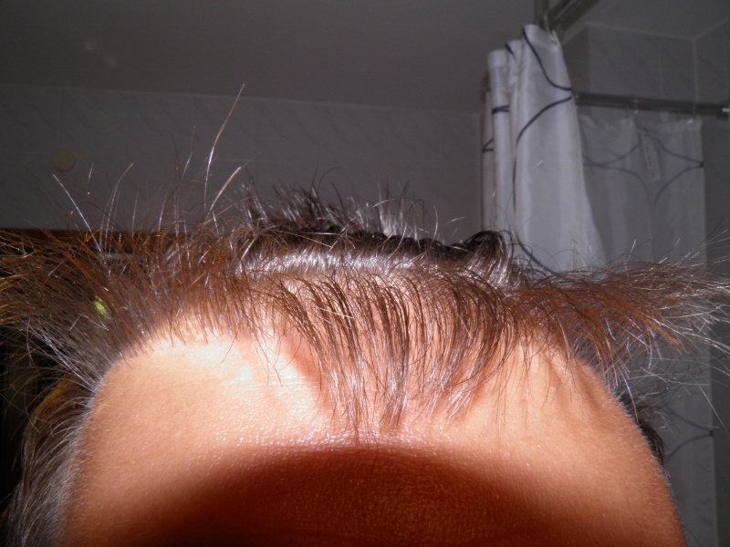 Ich habe noch mal drei Bilder angehängt. Die Bilder sind nicht gut, aber man kann trotz nach vorne gekämmter Haare die Haarline frei liegend sehen. Meiner Meinung nach müssten die Haare doch über diese drüber Richtung Gesicht fallen, so wie es in der Mitte ist...