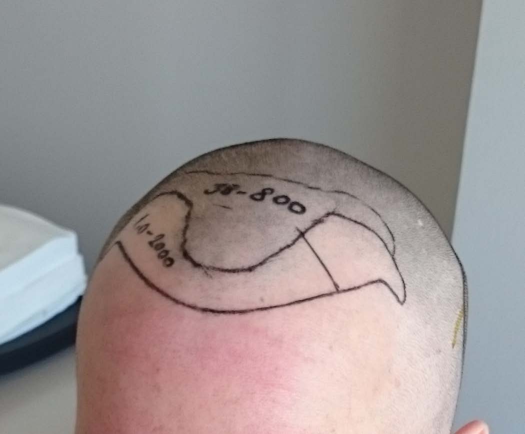 Habe während der Operation nicht immer alles mitgekriegt. Gelegentlich ist in der Front etwas unterspritzt worden. Vermutlich um stellenweise dichter zu setzen. Von 'dense packing' kann man wohl trotzdem nicht reden. Ich hatte dem Doc aber vorher erklärt, dass mir Dichte wichtig ist. Deswegen ist die Haarlinie auch recht konservativ. Der rechte, durch einen senkrechten Strich markierte Abschnitt wurde in der ersten Session schon mit etwa 550 Grafts bestückt. Die Haarlinie 1 cm weiter runterzuziehen hätte nach ärztlicher Auskunft locker 1000-1500 Grafts mehr bedeutet. Die war ich dann doch nicht bereit zu investieren. Man möchte ja noch Reserven am Hinterkopf haben