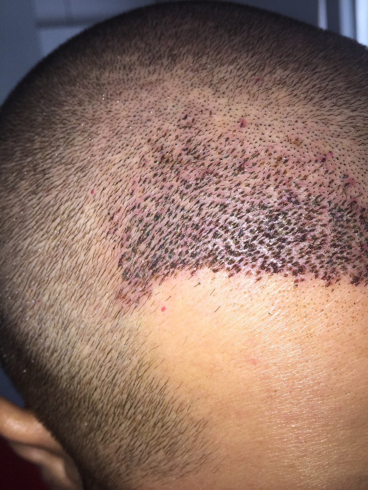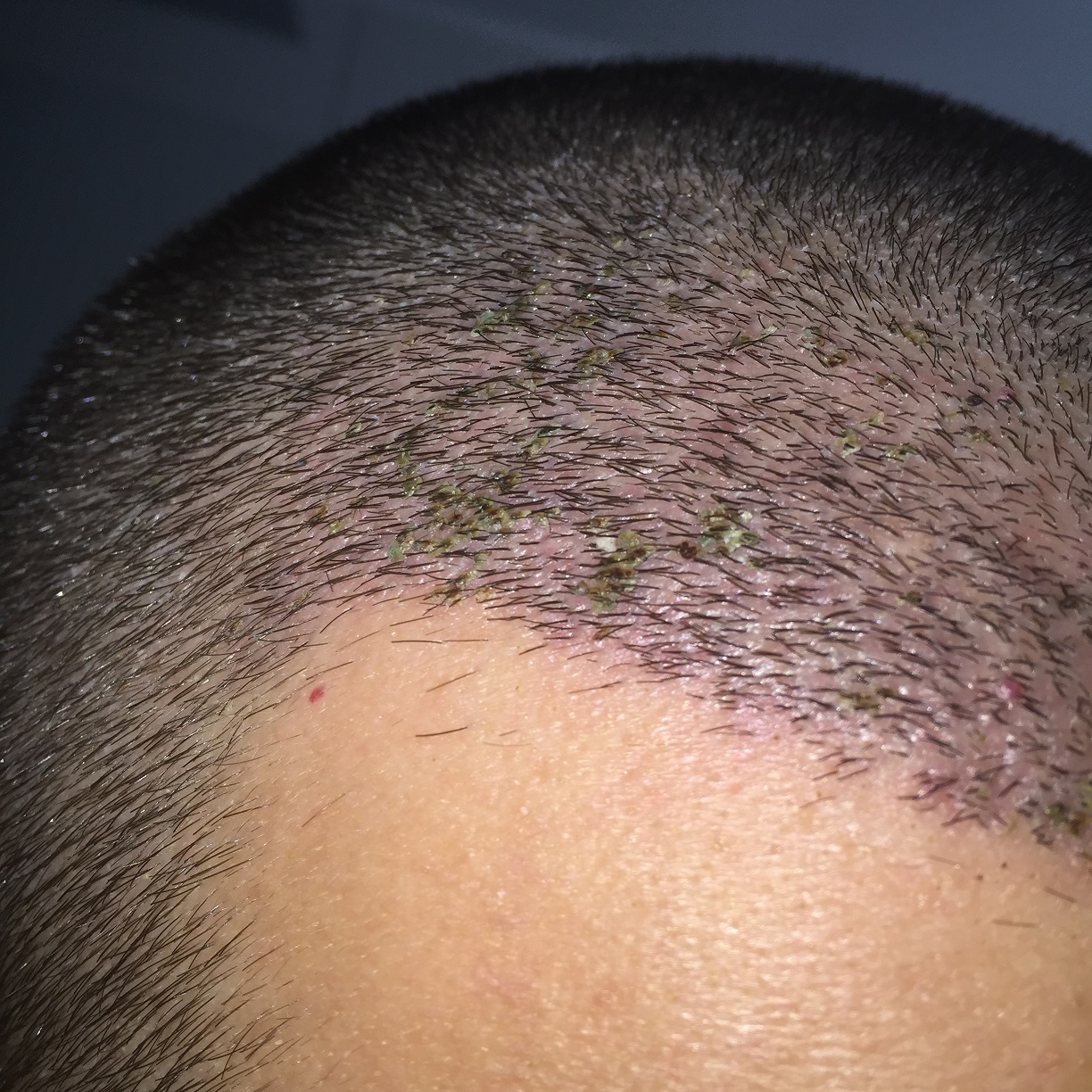 so es ist der 7Tag ich hab mich endlich getraut die haare mit dem Schampoo richtig zu Waschen davor hab ich immer noch getupft aus Angst halt jetzt eben mit leichten kreisenden Bewegungen sowie bisschen einwirkt so 4-5 min aber wie gesagt also davor das tupfen hatte ich das Gefühl das wird so nix xD naja hier das Bild könnt mir ja sagen ob das alle normal ist ^^ und ob es Dicht genug gesetzt wurde man will es ja immer so dich wie möglich haben ^^ es sind noch an par harren Krusten oder so was in der art kp dran aber die bekomm ich im mom nicht weg und kratzen oder rausreisen will ich es ja auch nicht