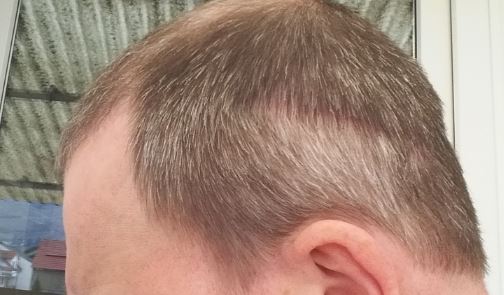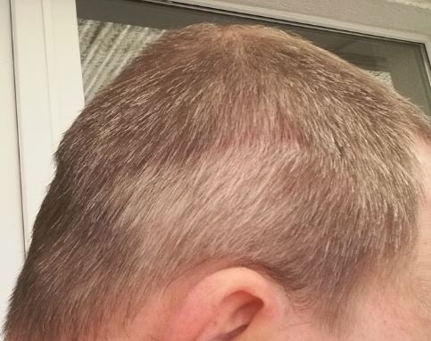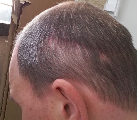 Die Haare an den Narbenendstellen über den Ohren sind noch etwas lichter. Da ich aber graue Schläfen habe sieht es auf den Bildern lichter aus wie es in der Realität ist.