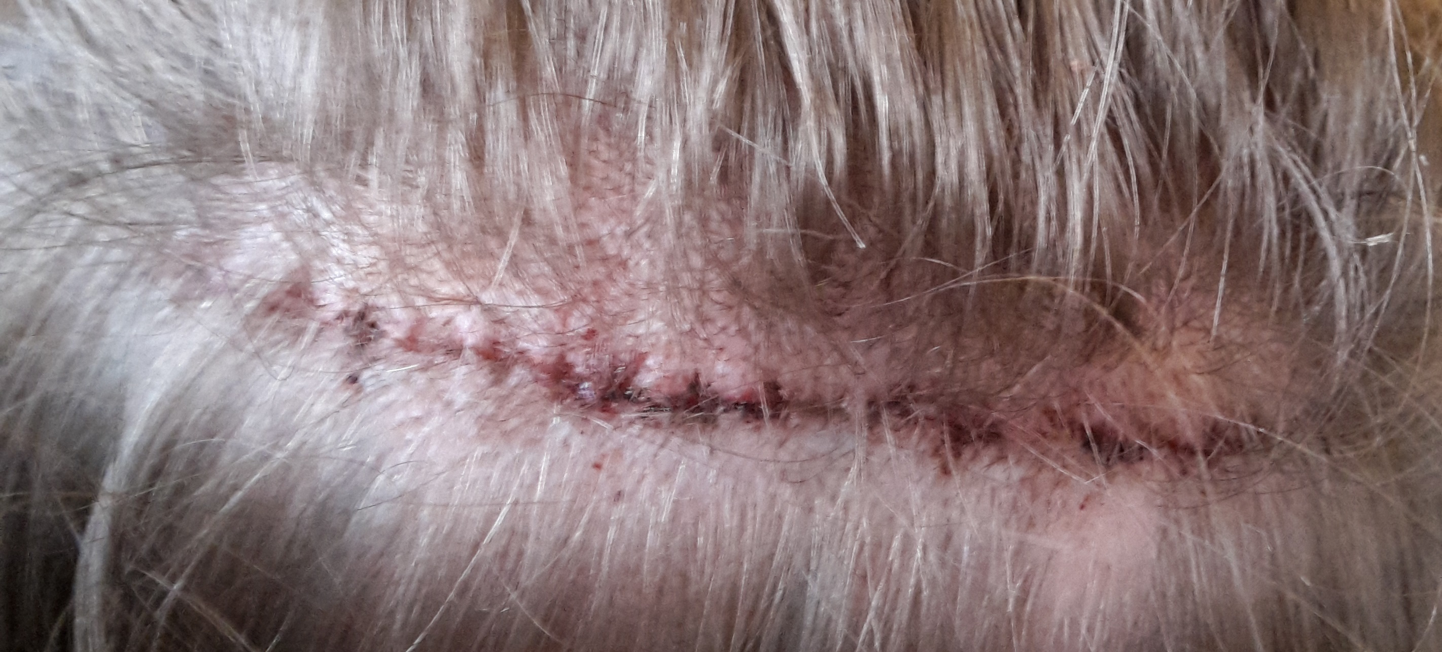 Halb 10 hatte ich eine Nachkontrolle inkl. medizinischer Haarwäsche, wo die Krusten und die Narbe vorsichtig gereinigt wurden.