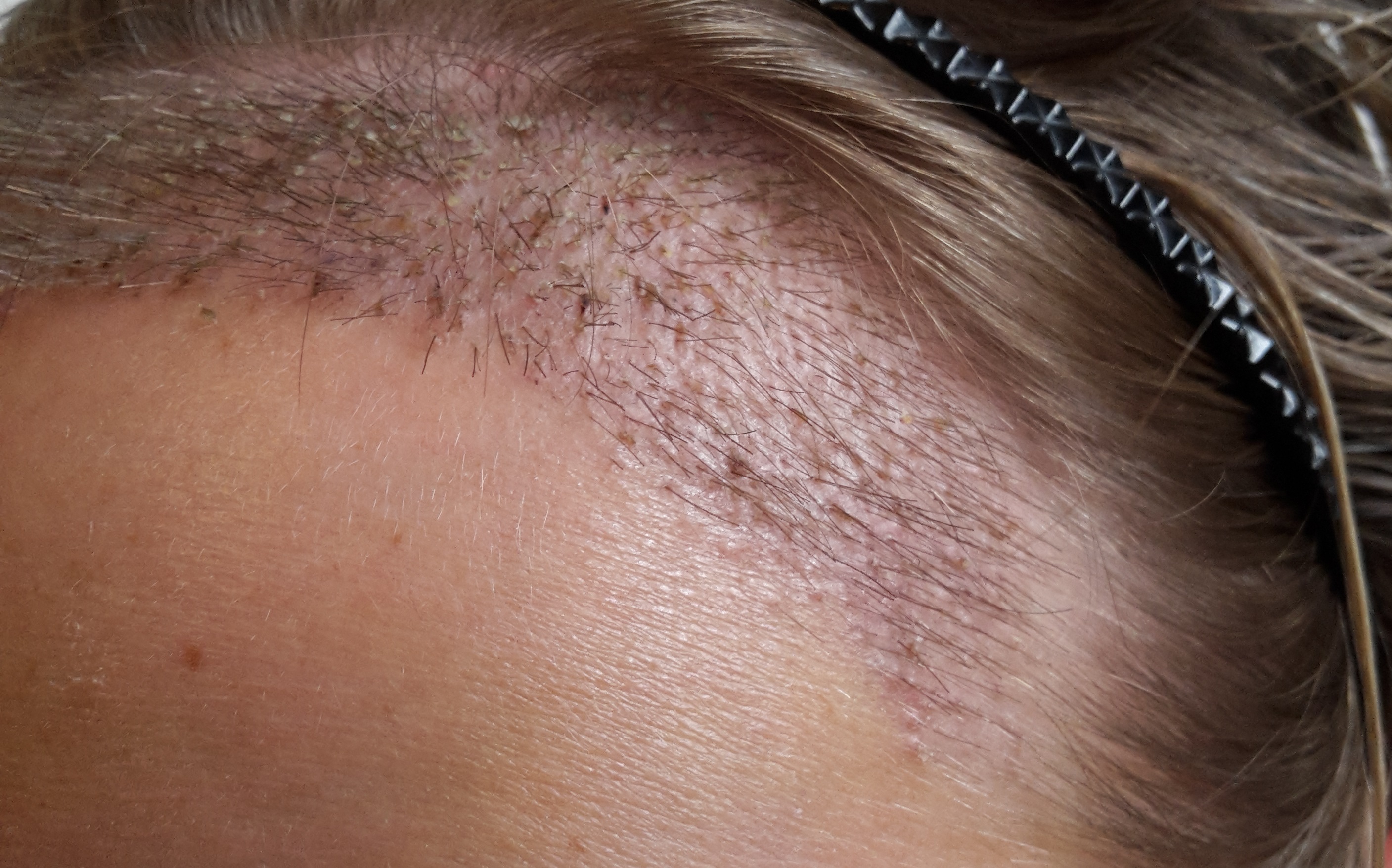 Nach der Behandlung wurden meine Haare mit Desinfektionsshampoo gewaschen und mir wurden Zöpfe über und unter der Narbe geflochten.