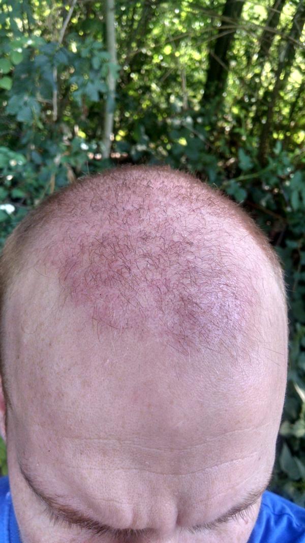 Hier habe ich mal ein Foto ca 1 Monat Post OP. Die meisten Transplantate sind wieder ausgefallen. Aber das ist ja ein normaler Prozeß und jetzt heißt es erstmal warten.... Very Happy