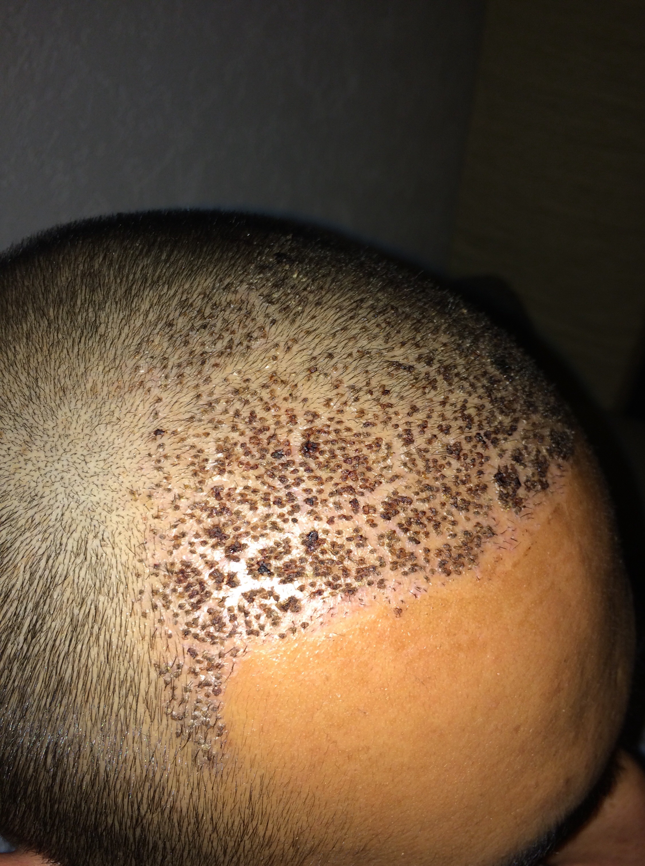 Bei ihm wurde der Scheitelbereich aber nicht ausgespart und - wie schon erwähnt - die Grafts anscheinend enger gesetzt (außer man erkennt es bei dir nicht so gut, wegen der großen Krusten). Sollte es so sein, müsste man also mindestens noch mal 200-300 Grafts abziehen ... schlussendlich wären das leider dann nicht viel mehr als 2000 Grafts, die bei dir eingesetzt wurden. Vielleicht irre ich mich aber auch, hoffentlich (auch ich gönne dir natürlich ein gutes Ergebnis) ... wenn ich mit meinen OP-Bildern vergleiche, dann passt das aber in etwa.