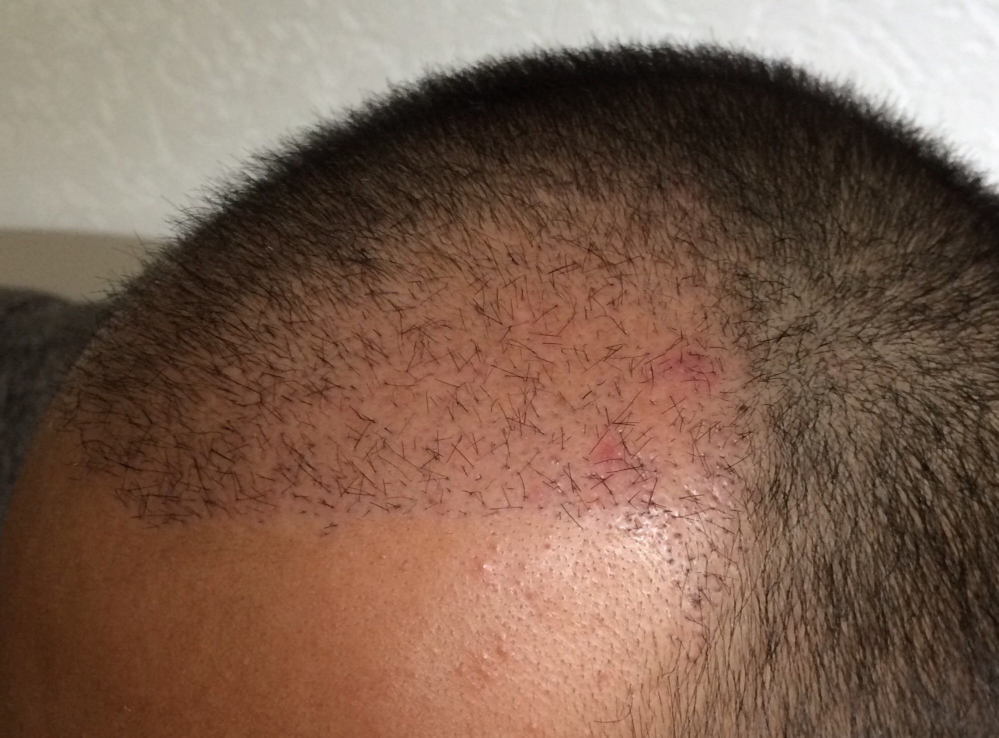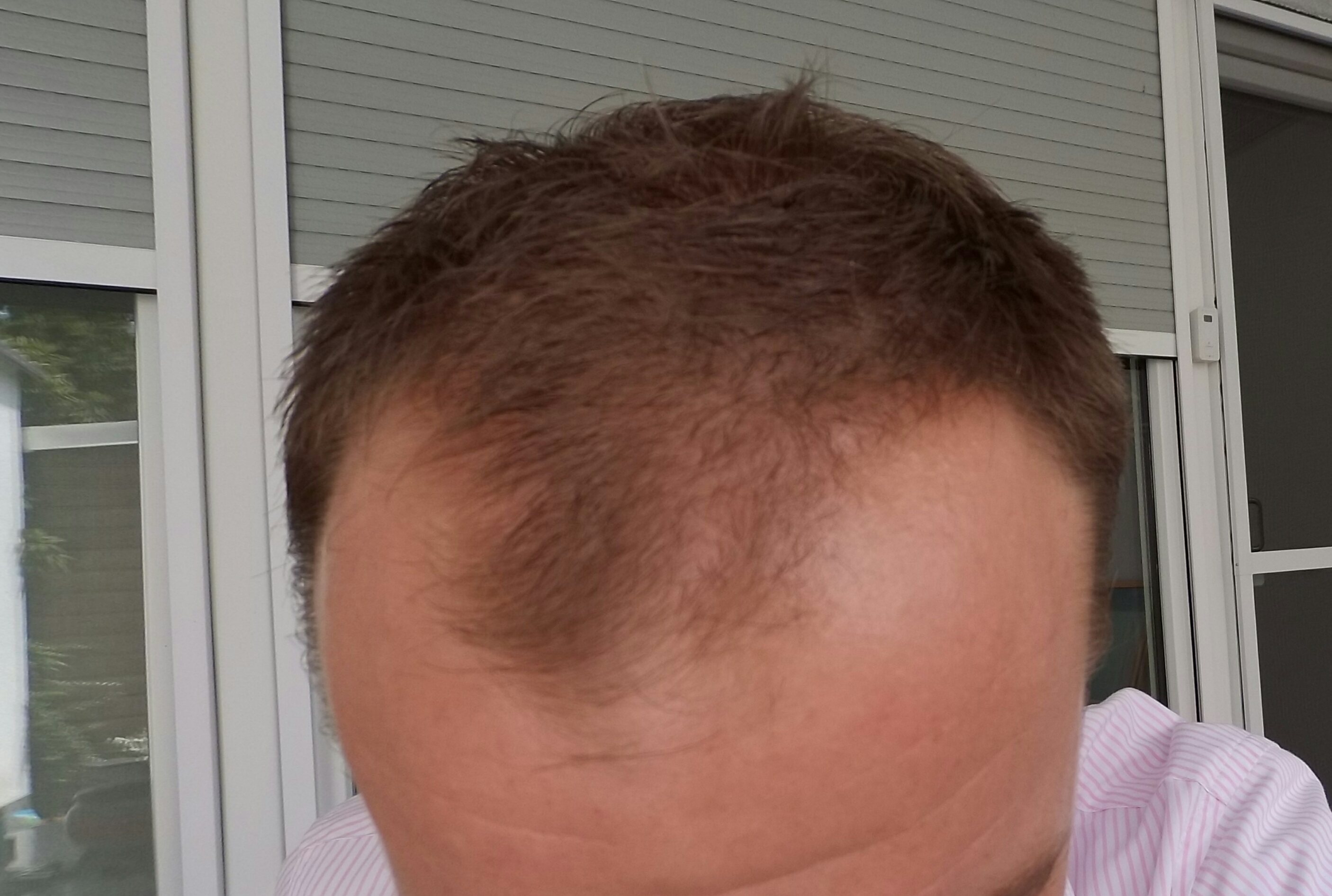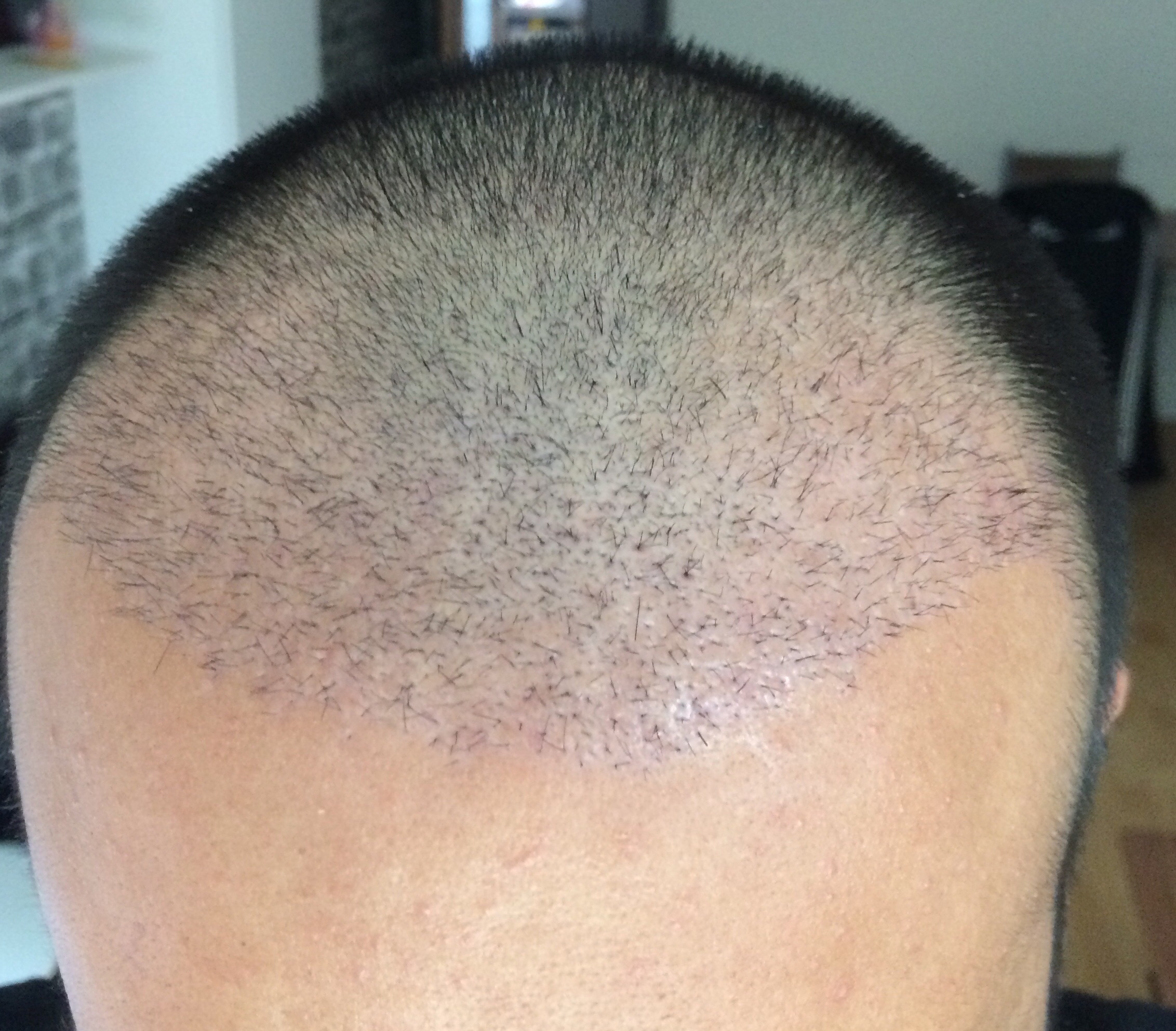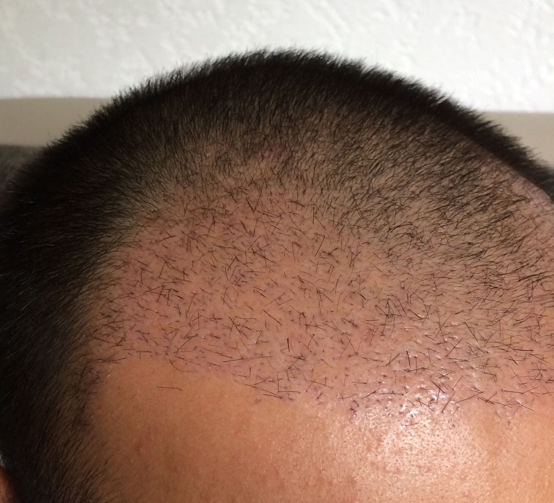 Die meisten Grafts sind jetzt abgefallen. Während einzelne Haare hier und dort noch ausfallen, sprießen die als erstes ausgefallenen Haare wieder langsam aus dem Kopf.