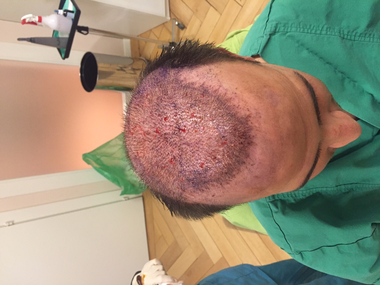 Gestern war es nun soweit. Ich wurde um 07.00 Uhr von Herrn Muresanu emfangen, wir machten Vorher Bilder, er zeichnete mit die Haarlinie ein und dann ging es auch schon los. Geplant waren 5300 Grafts, rausgekommen sind glücklicherweise 5832 Grafts. Der Teil ging relativ schnell, ich glaube nach 90 min waren wir mit dem entfernen des Strips durch und die klammern ( ca. 55 Stk. ) waren im Entnahmebereich eingesetzt.