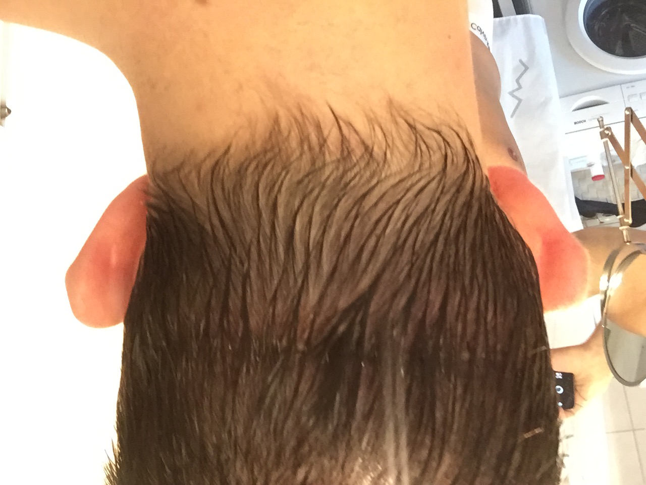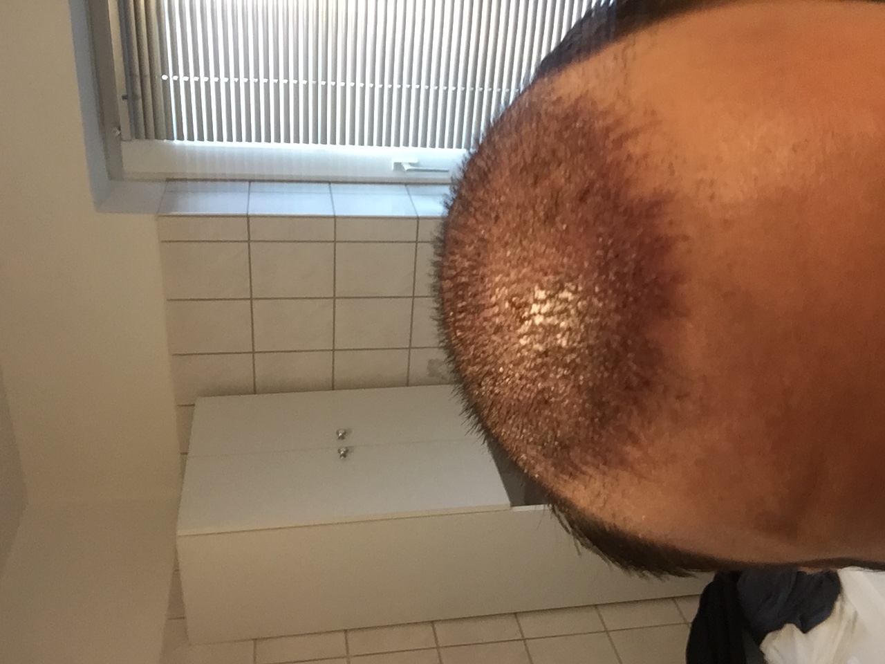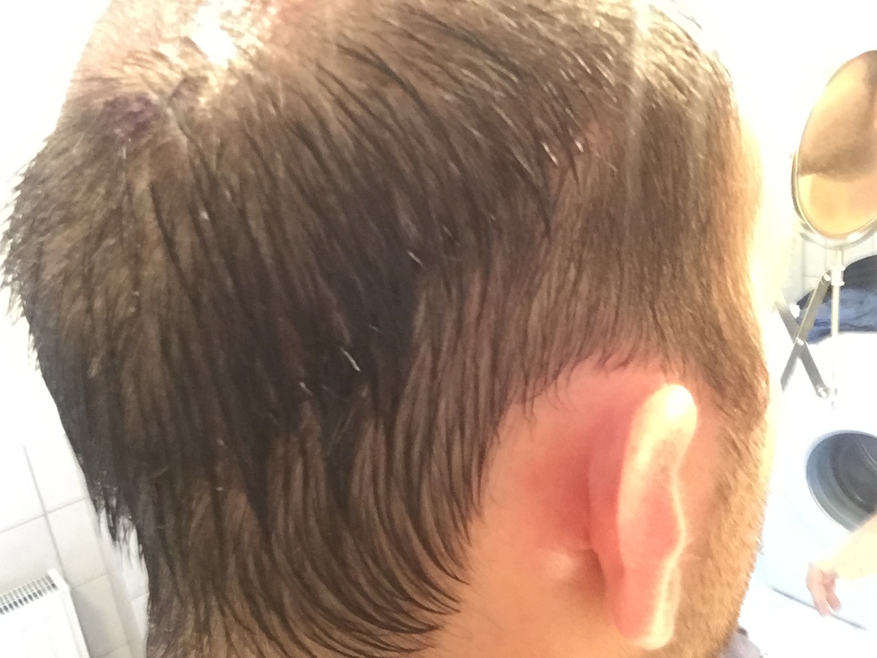Der Empfängerbereich ist immer noch leicht gereizt und die Spenderzone oberhalb der Narbe noch sehr taub, aber ich denke das ist alles eine Frage der Zeit. Die Narbe selber ist auch noch ein wenig empfindlich. Ich habe leider ganz leichten Schockless an zwei Stellen der Narbe, aber auch das vergeht, ist nicht ganz so schlimm, trage die Haare bis die Narbe besser verheilt ist sowieso ein wenig länger, ich denke man muss da ein wenig experimentieren, was am Besten aussieht.