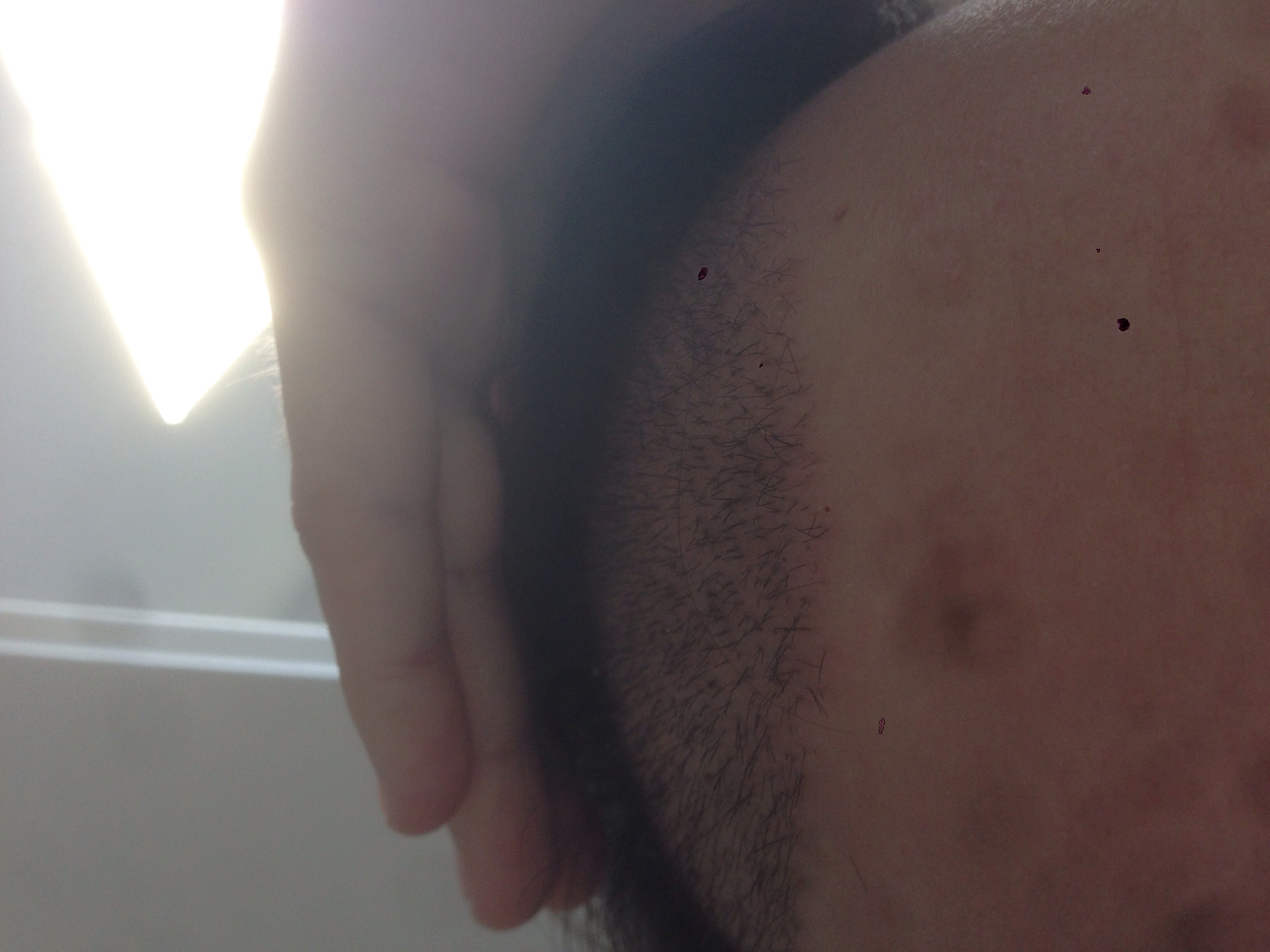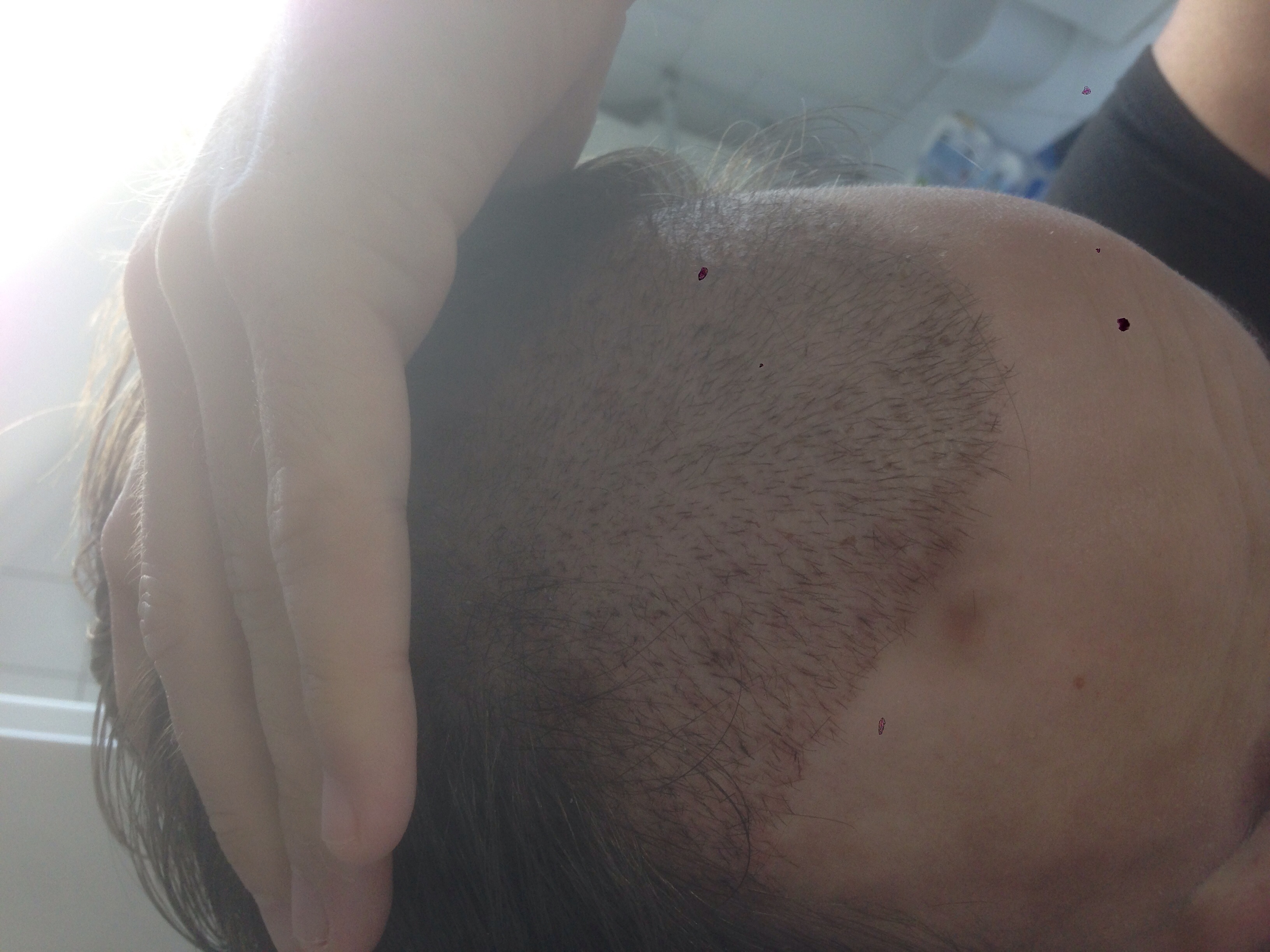 Anbei lade ich nun noch ein Foto pre op und Post op hoch. Es war mein ausdrücklicher Wunsch, dass nur das Entnahmegebiet rasiert wurde. Im front Bereich wurde nur ein kleiner Teil Haare, der noch verblieben war, rasiert, damit man die komplette front als Fläche zum einsetzen benutzen kann. Ich weis und mir wurde vor Ort erklärt, dass auch der restliche Bereich rasiert werden könnte/müsste, damit man dort noch verdichten kann. Aber deshalb war ich nicht dort, sondern nur für die front. Dies zur Erklärung, falls viele sich wundern.