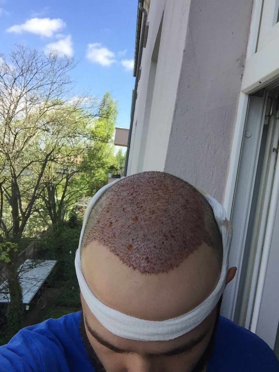 Nachdem das Einsetzen der Grafts erledigt war, bekam ich einen Verband. Dann hat sich