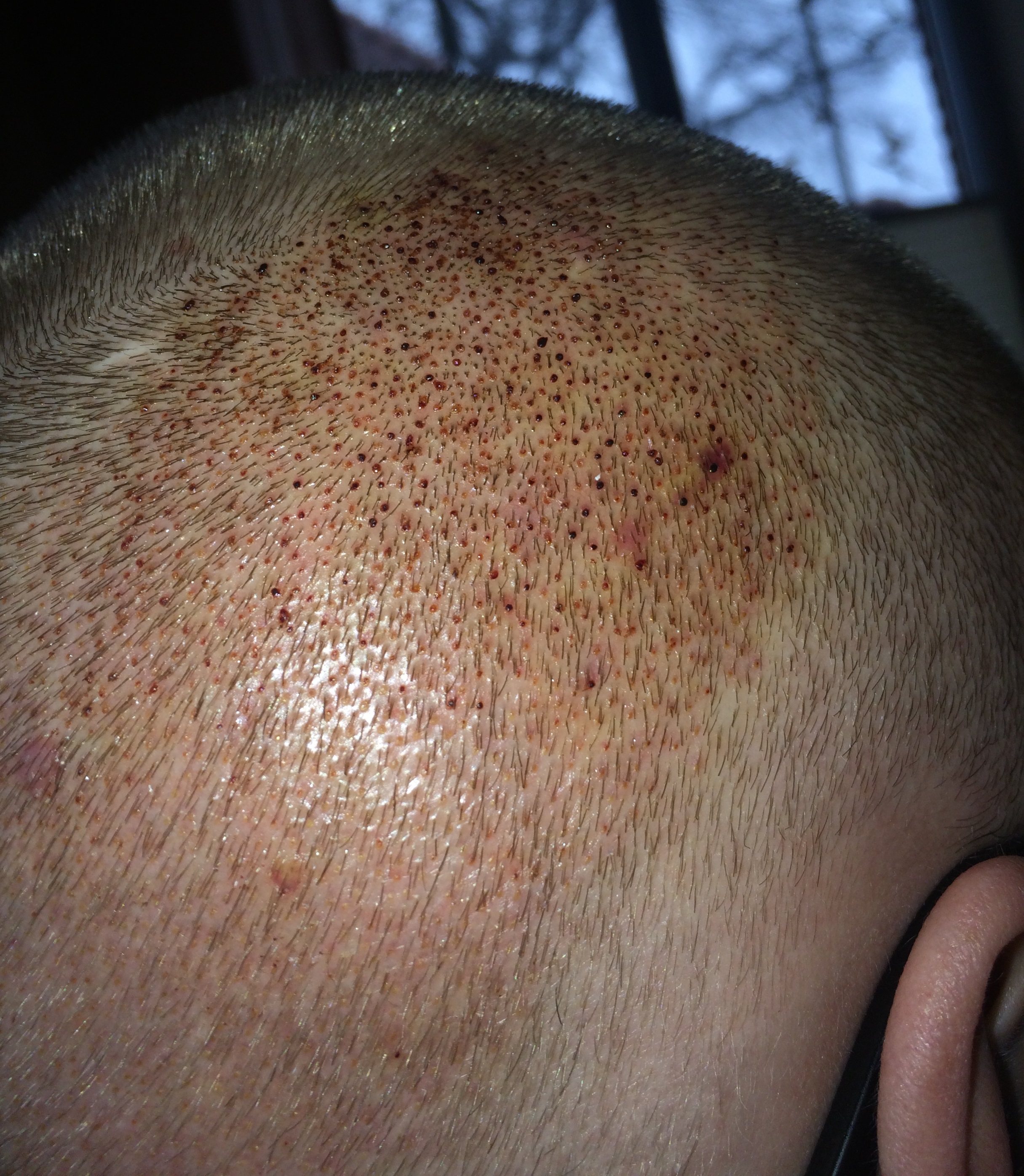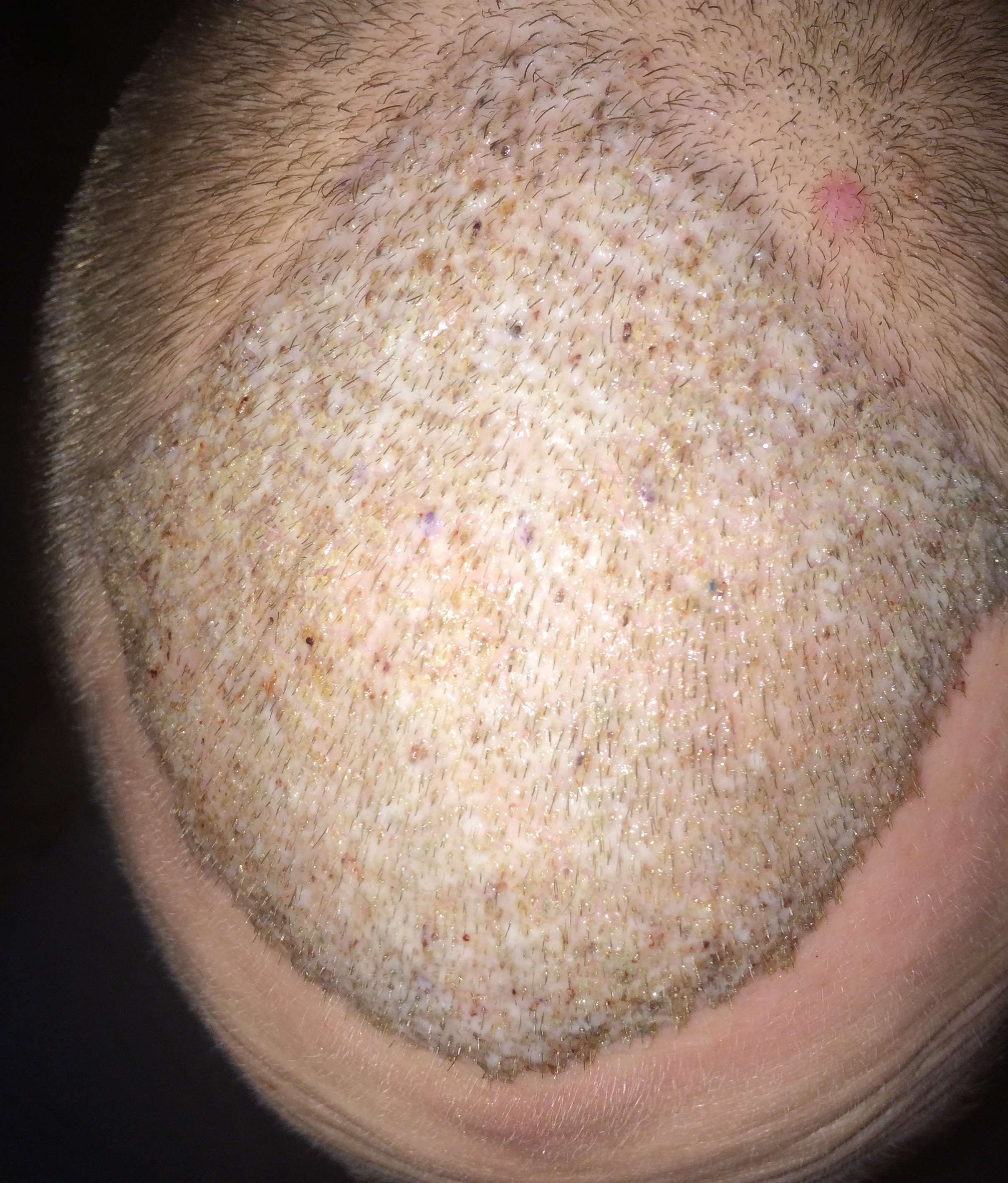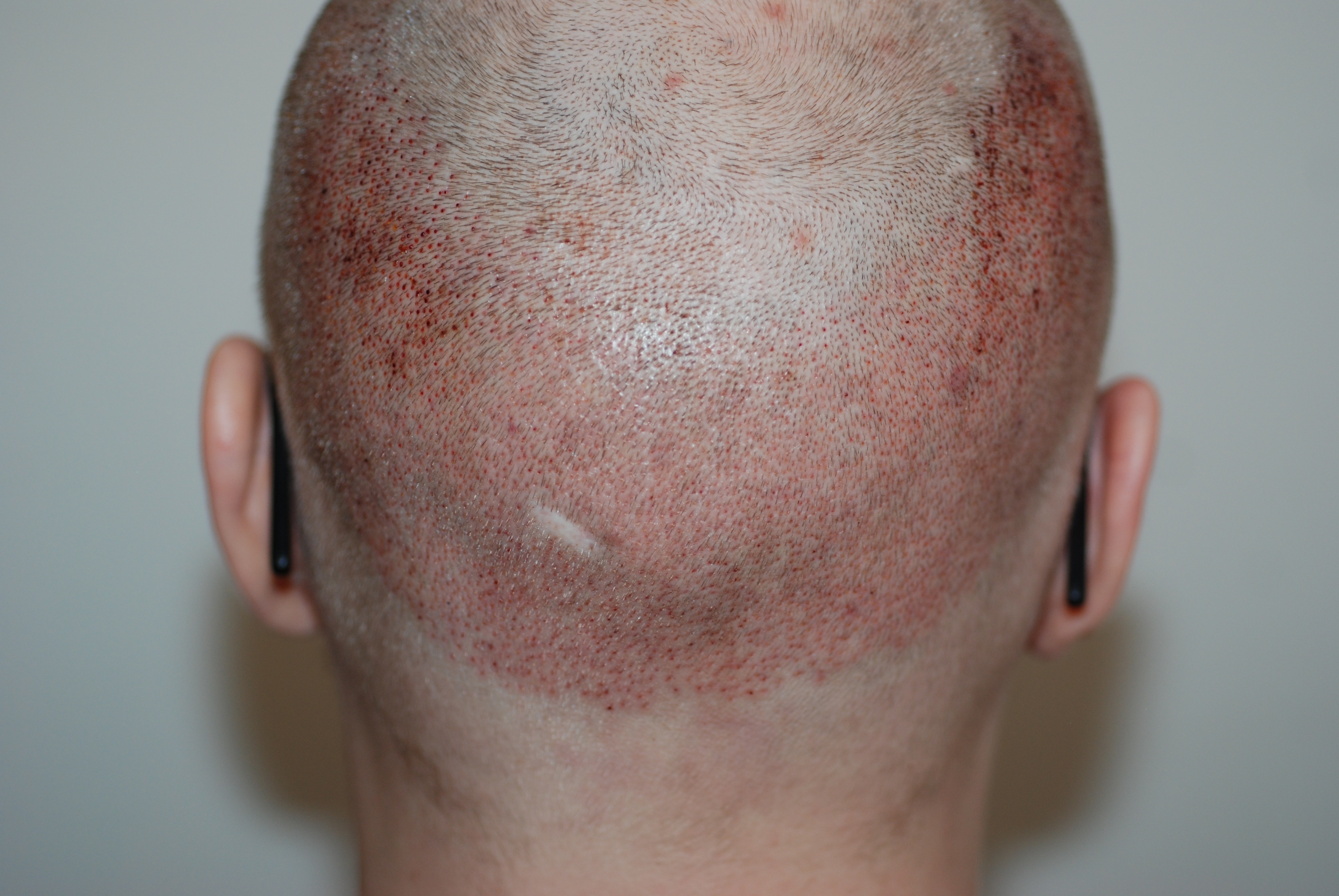Zum Verlauf kann ich sagen: Ich bin jetzt im 4.Postop Tag und das große jucken und kribbeln im Empfangs-& Spendergebiet fängt an, meine Kopf hat eine interessante Form angenommen durch die Schwellung, und der Spenderbereich ist ein wenig empfindlich. Feriduni sagte eine Hyperästhesie (Überempfindlichkeit) kann auftreten durch Irritation des Nervengewebes, also mache ich mir keine Sorgen. Ich habe das Gefühl der Empfängerbereich strahlt ein wenig wärme ab und spannt aber ohne zu schmerzen. Da ich gestern die letzte Antibiotikabombe genommen habe und diese für 14 Tage wirken soll, gehe ich also mal nicht von einer Entzündung aus... Hat evtl. jemand da ähnliche Erfahrungen?? Laut Feriduni habe ich einen Empfindlichen Hauttyp, dementsprechend werde ich vermutlich noch länger was von der Rötung haben. Mein Donor ist mittig schon ganz gut, quasi meine Liegefläche beim schlafen. Seitlich sieht er leider noch ein wenig mitgenommen aus