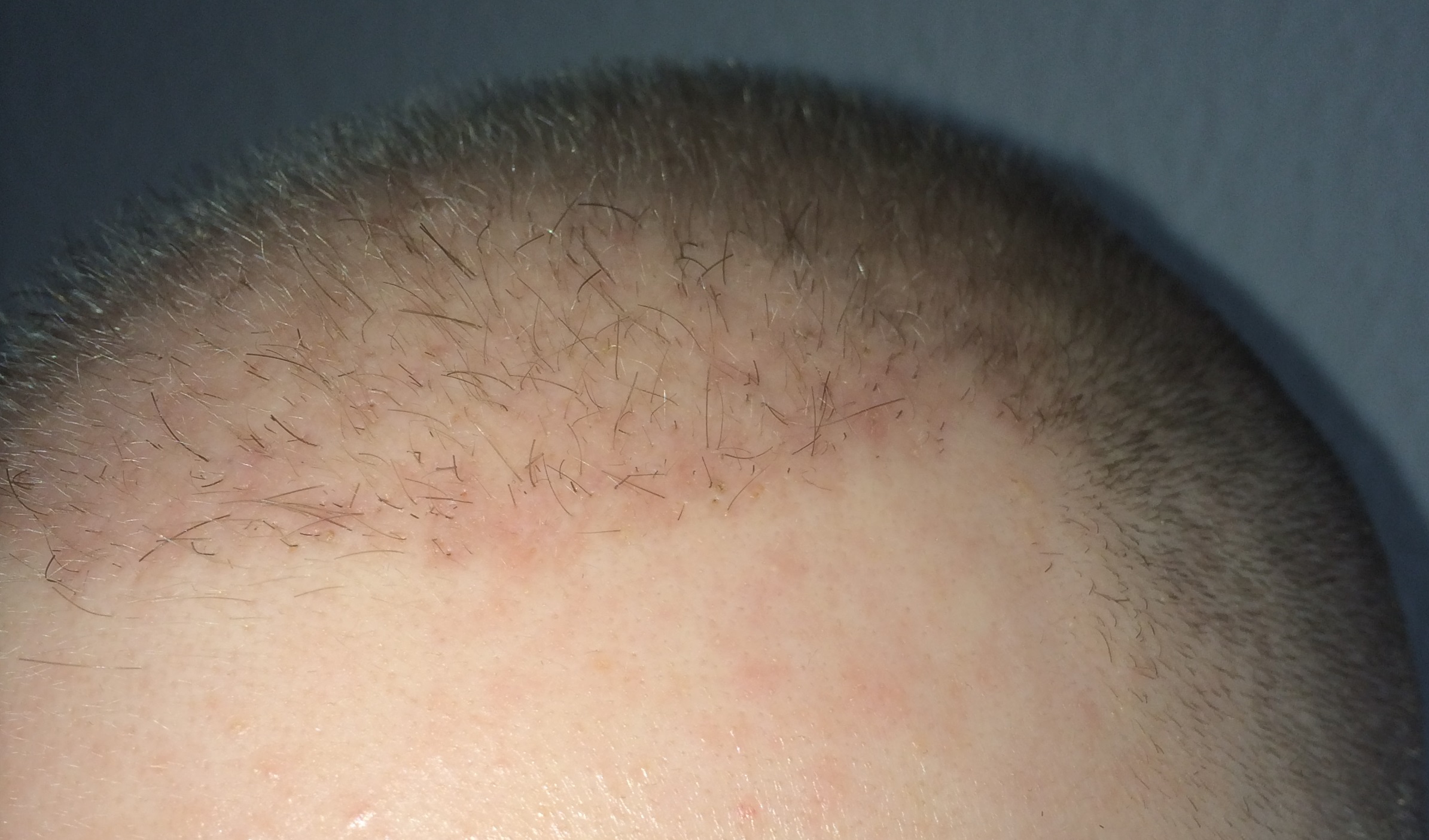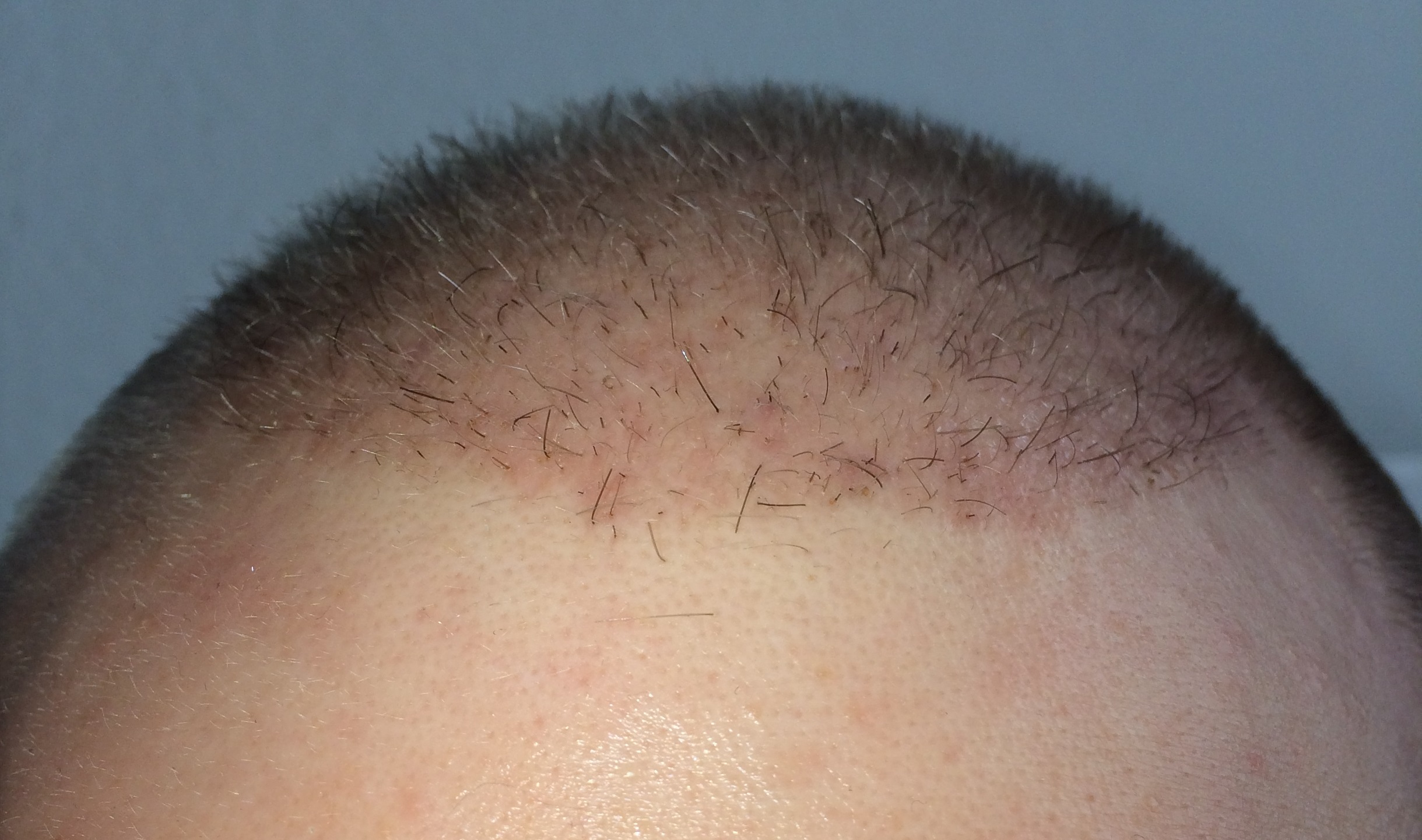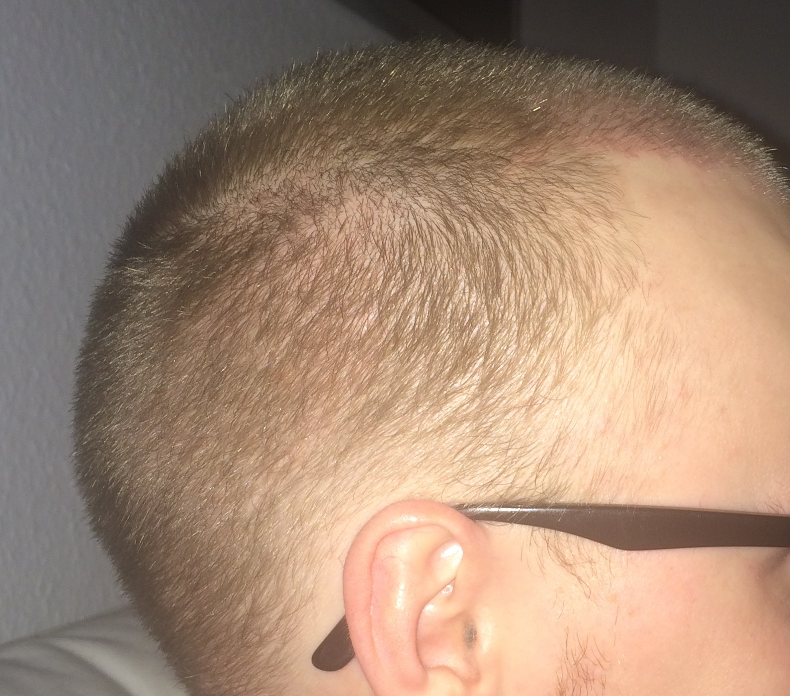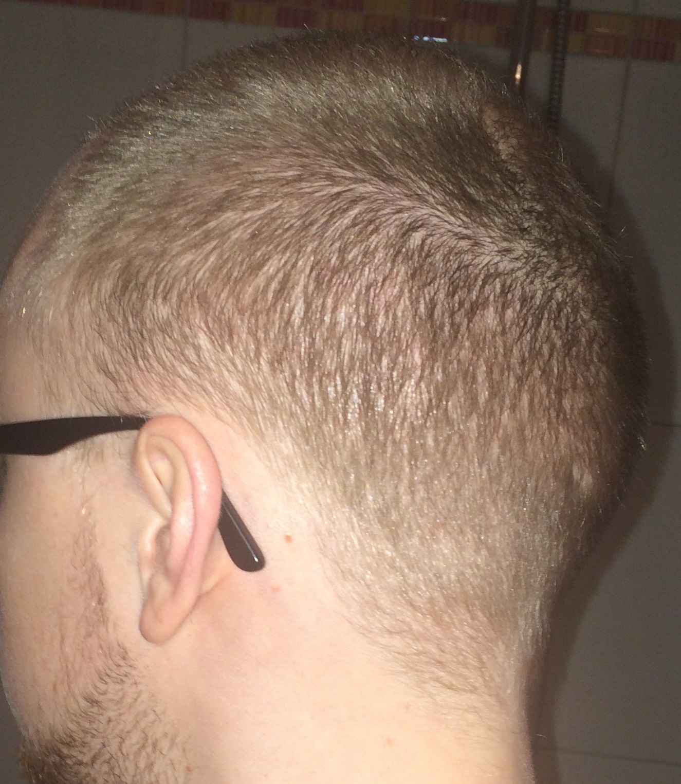 Seit dem letzten Update hab ich meine Haare nur noch an den Seiten geschnitten den Rest habe ich mal 2 Wochen sprießen lassen. Es ist schon ein wenig was gekommen leider sind die Haare noch sehr fein und hell, sehen aus wie Babyhaare... dementsprechen sehr schwer auf Bildern einzufangen. Ich habe die Bilder einfach mal mit Blitz gemacht, gerade nach meinem fachmännischen Haarschnitt und heißen dusche. Man kann die "Babyhaare" wohl durch den Blitz erahnen und ein paar dickere und dunklere sieht man definitiv ! Freue mich auf eure Kommentare und halte die Crowd natürlich auf dem Laufenden