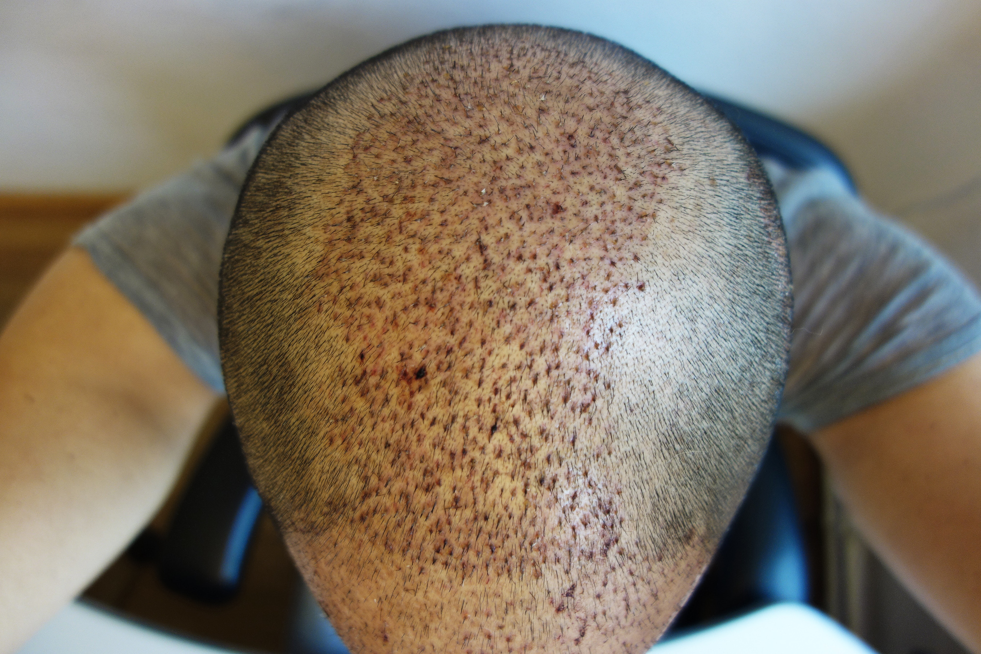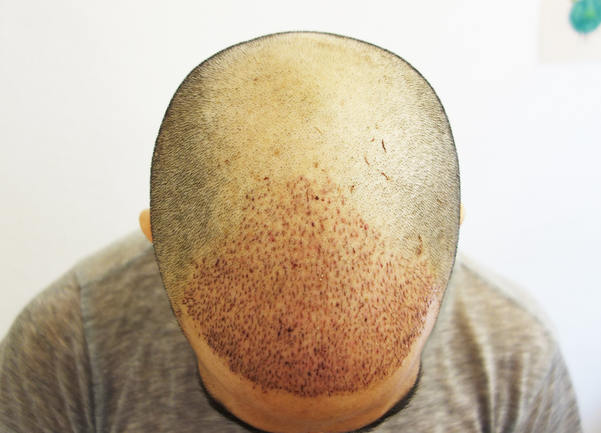 Hier mal die Tonsur im Close-Up am Tag 2 nach der OP. Ein paar der kleineren Haare waren schon da, die sind etwas gestärkt worden seit ich Minox vor 6 Monaten angefangen hatte.