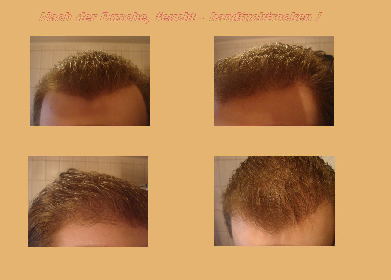 hier noch mein Update zum Bergfest ! Gestylt sieht es schon sehr gut aus, auch ohne Concealer ! Habe aber diesmal Aufnahmen mit handtuchtrocken/feuchten Haaren gemacht. Was mir sehr stark auffällt ist, daß ich vorne sehr gewellte Haare/Locken bekommen habe, was natürlich zu einer bessern Blickdichte verhilft, aber komisch oder ?