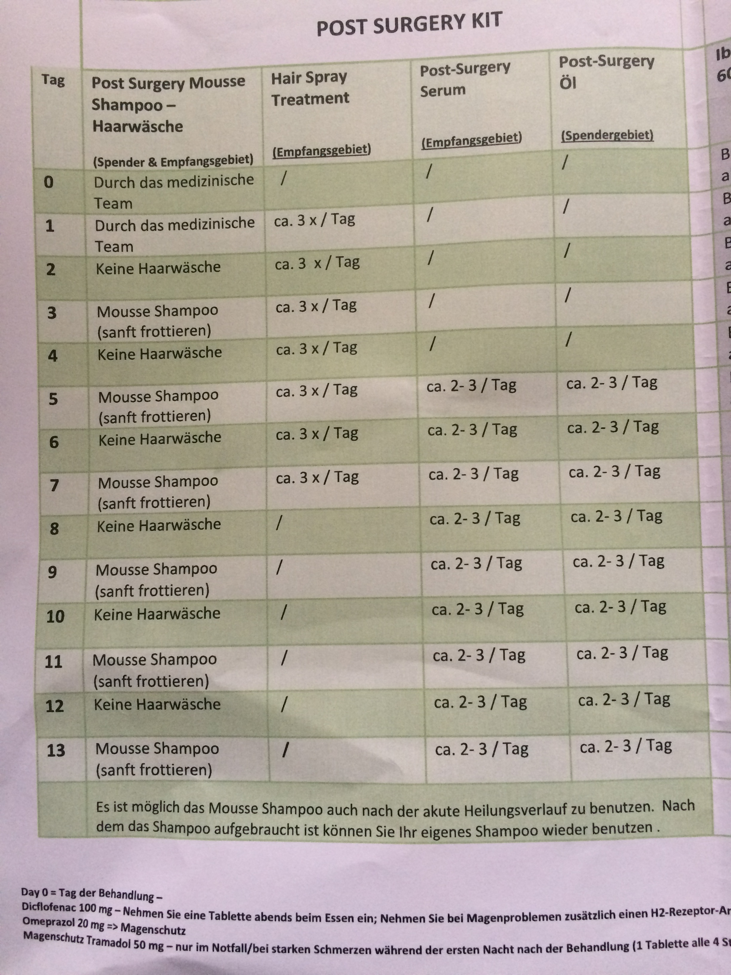 Ab morgen kann ich schon zusätzlich zum Vitaminspray das Serum ( eine Art Gel) für den Empfangsbereich und das Öl für das Spendergebiet verwendet.Ich Lade mal ein Bild von meinem "Carepaket" und dem Plan für die ersten 14 Tage Post Op hoch. Zwei-Drei Bilder vom aktuelle stand lade ich ebenfalls hoch aber entschuldigt die Qualität, momentan ist niemand zuhause der mich fotografieren kann und meine Selfieskills sind mehr als bescheiden.